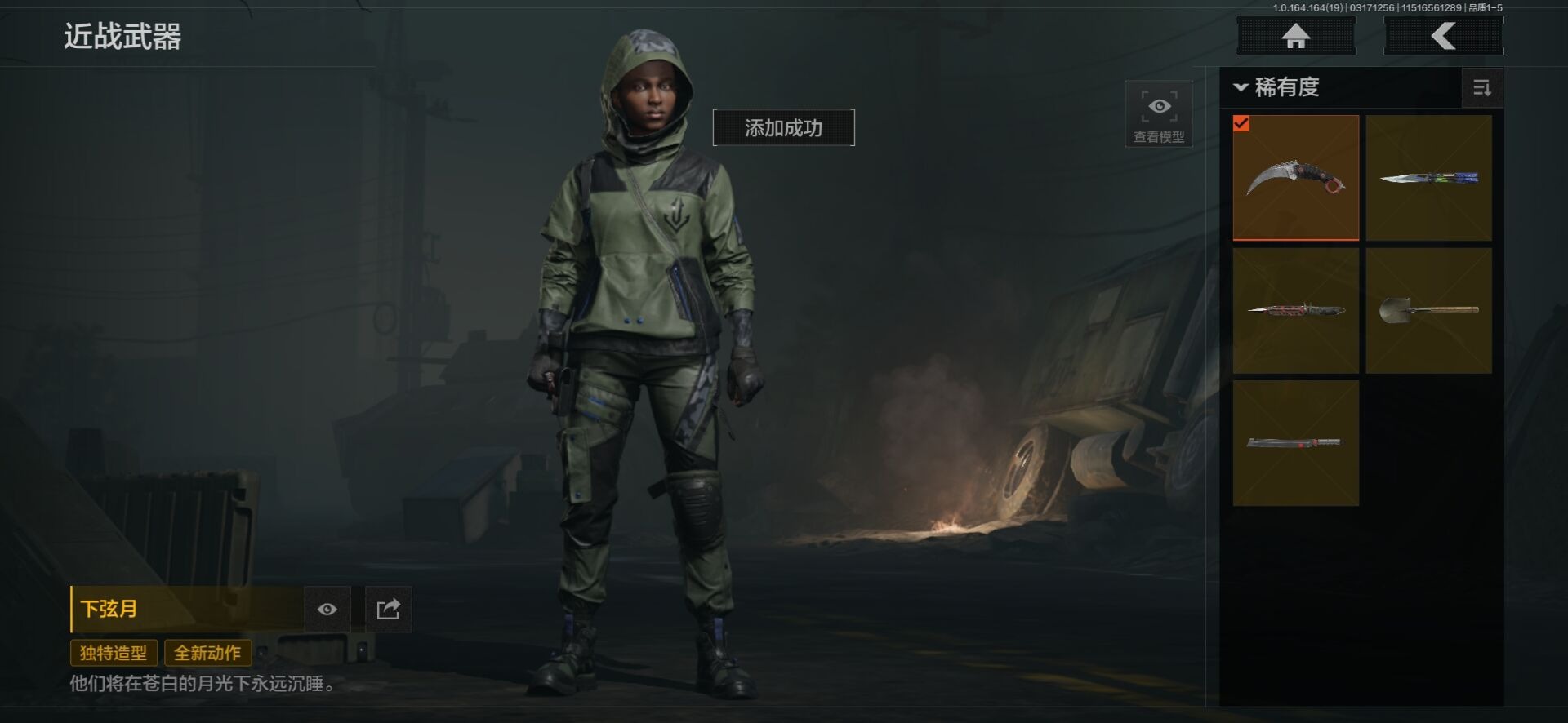 [17801949]实名: 可修改 柯恩币数量: 6711 仓库价值: 24 金枪数量: 4 角色装扮(金): 林中人·特遣作战服,弗雷德,金红闪电套装 近战武器: 胜利军刀,涂鸦利刃,下弦月,来战·开山刀,工兵铲 金色枪皮: 黄金·M4A1,诸星之子·FAL,水果·AR57,蓝色咆哮·H416 紫色枪皮: 逆火·MDR,极恶·AUG,丛林法则·T951,壁垒·AN94,危崖敌影·F2000,无