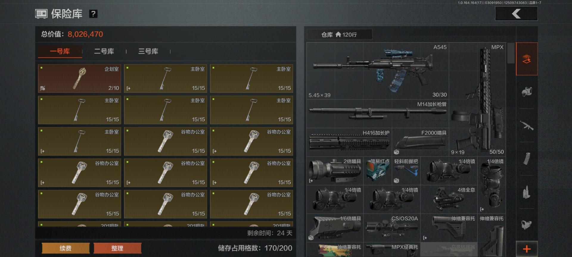 [17558564]实名: 可修改 柯恩币数量: 578694 仓库价值: 102 金枪数量: 2 角色装扮(金): 钢铁壁垒作战服 近战武器: 急袭弯刀,明刀·绣春,涂鸦利刃,来战·开山刀,工兵铲 金色枪皮: 冰河碎影·MK14,旧王圣谕·VSS 紫色枪皮: 深暗星云·M4A1,夏日风情·SCAR,危崖敌影·F2000,危崖敌影·MPX,无声暗月·AX50,涂绘猎人·AR57,雪原凌锋·AK7
