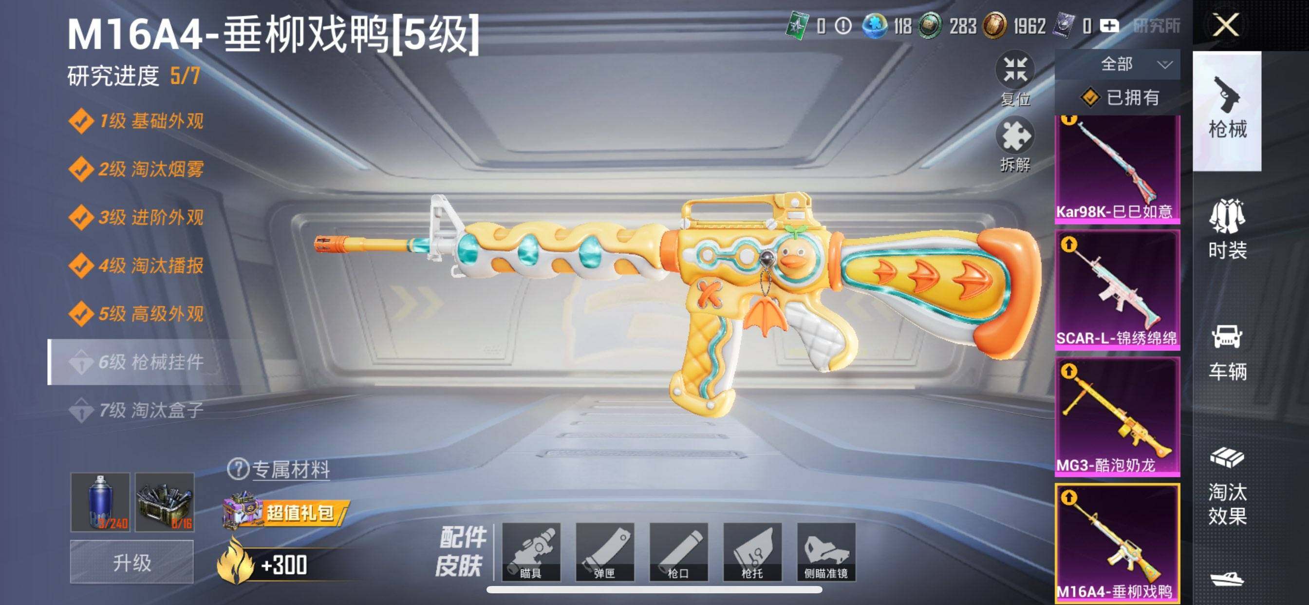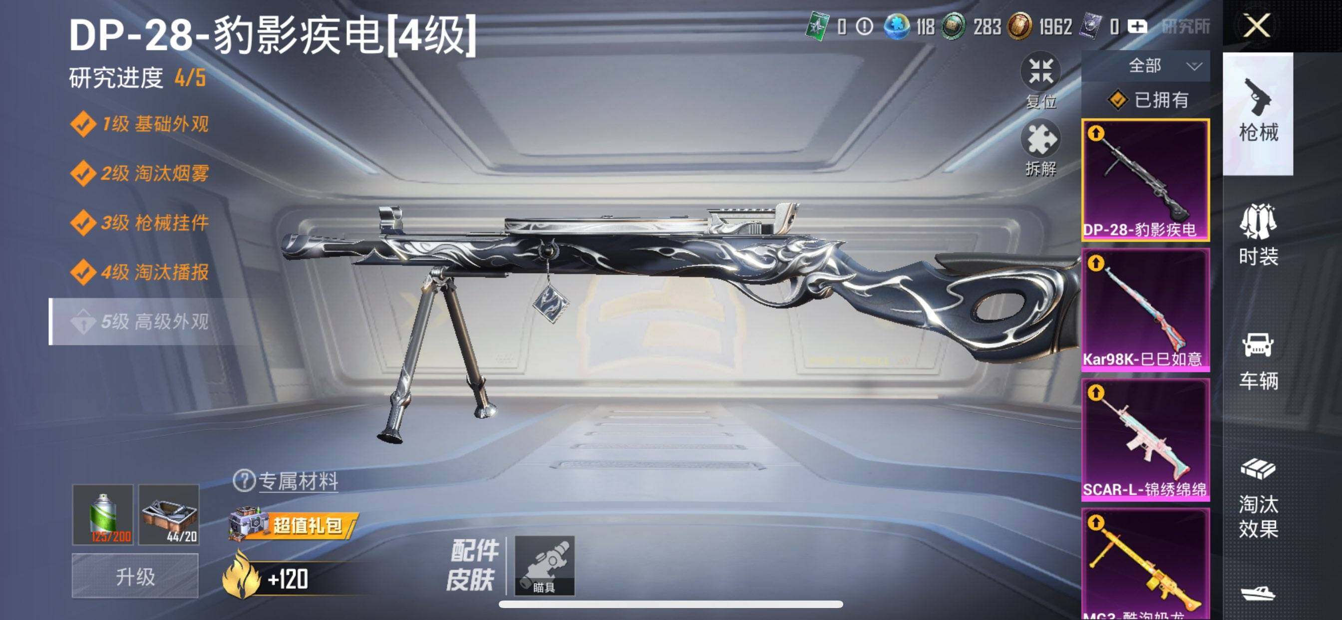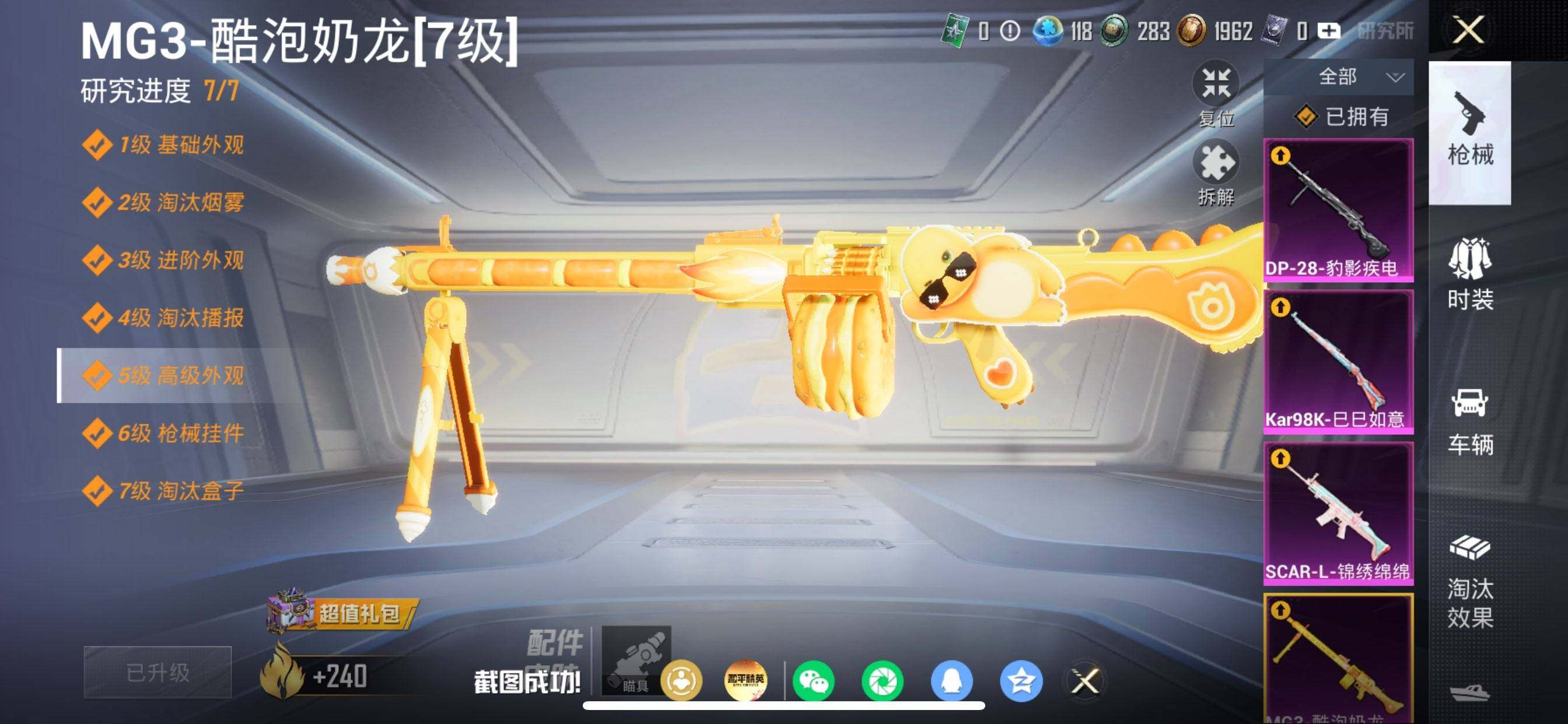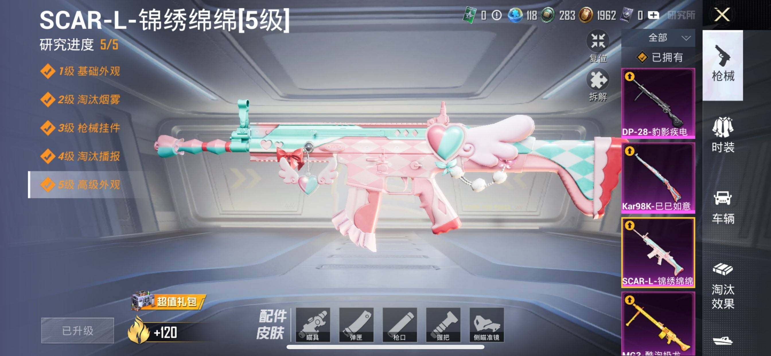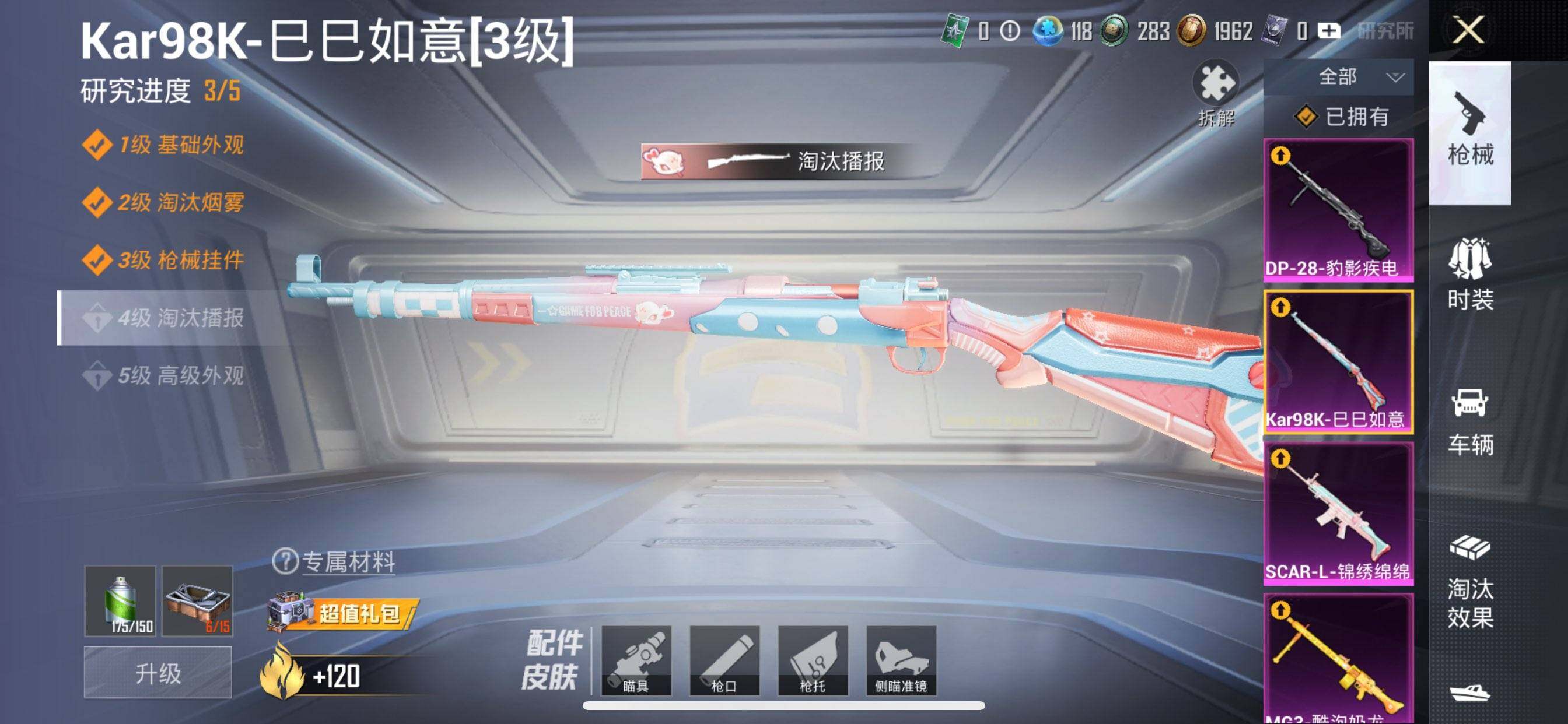 【粉色枪皮等级】:M16A4-垂柳戏鸭(五级),SCAR-L-锦绣绵绵(五级),Kar98K-巳巳如意(三级),DP-28-豹影疾电(四级),MG3-酷泡奶龙(七