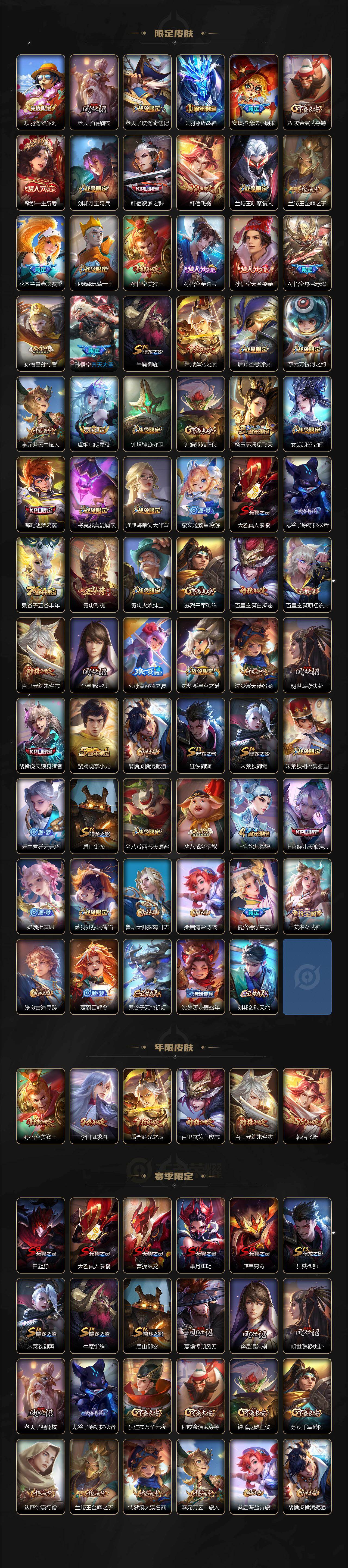 【传说皮肤】:阿轲罗刹妄海,韩信踏浪归,云缨神骥越千峰,关羽神骥镇沧海,朵莉亚神骥鸣幻洲,狄仁杰神骥赴朔漠,貂蝉神骥聚万邦,马超神骥逐星野,花木兰异界灵契,后羿神树通天,桑启鸣野蒿,夏洛特浮生
