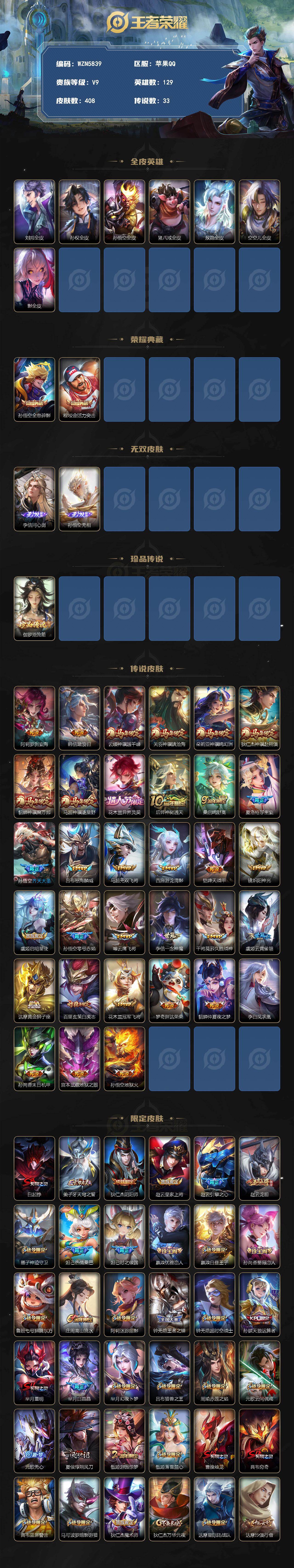 苹果Q-V9-至尊星耀IV段位-129英雄-408皮肤-2典藏皮肤-2无双-1珍