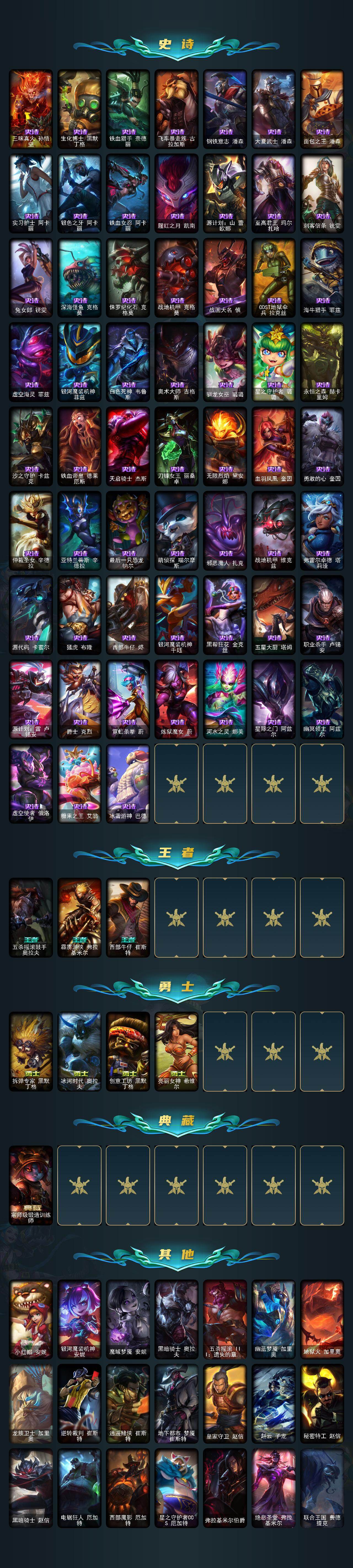 未定级段位-172英雄-670皮肤-414炫彩-1终极-68神话-95限定-68传说-94史诗