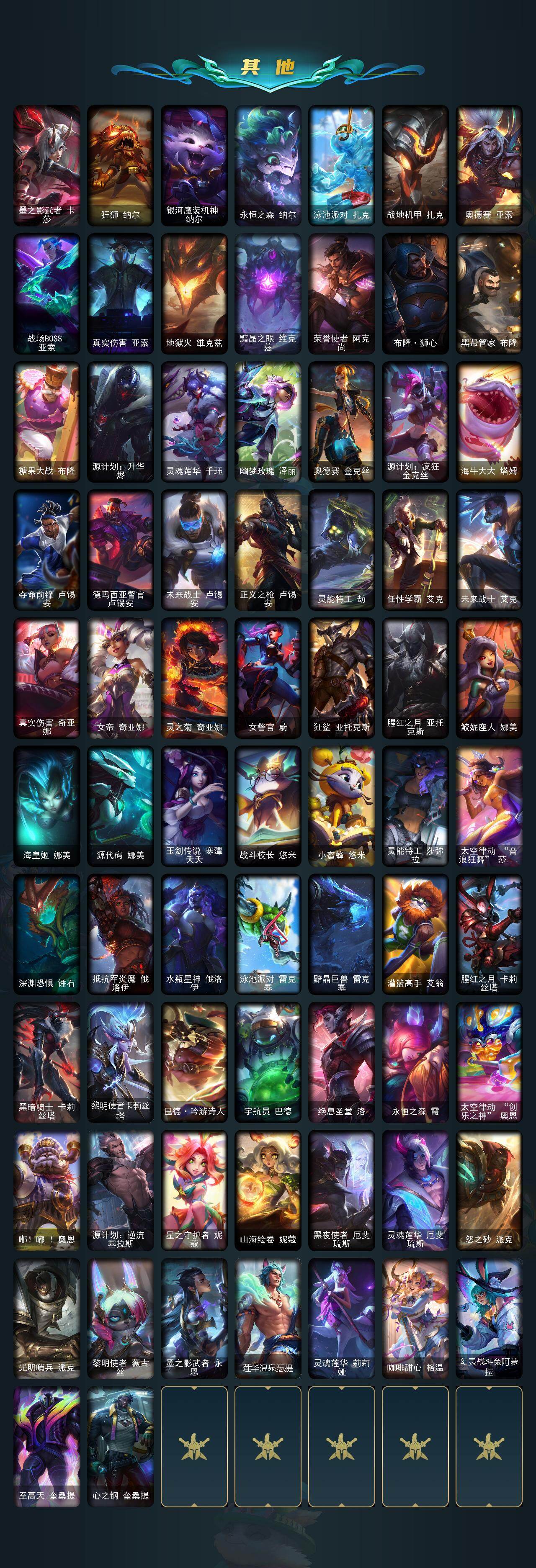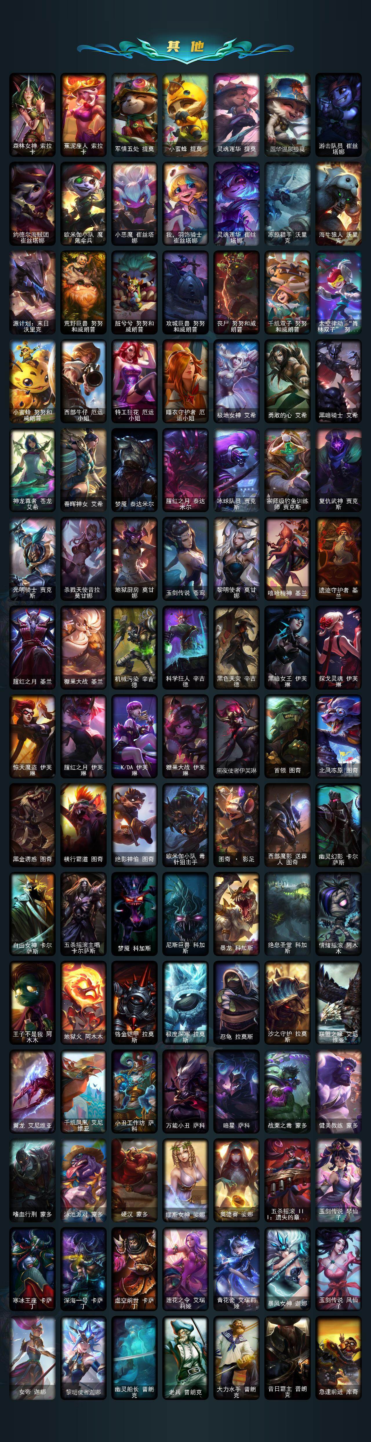【神话皮肤】:十周年纪念安妮,源代码乐芙兰,殿堂传奇乐芙兰,十五周年纪念希维尔,水晶圣骑艾希,神凰行者瑞羽圣凰艾尼维亚,殿堂传奇薇恩,灰烬骑士莫德凯撒,水晶巫灵泽拉斯,水晶泰坦诺提勒斯,星之守护者塔莉垭,永恒之森奥恩