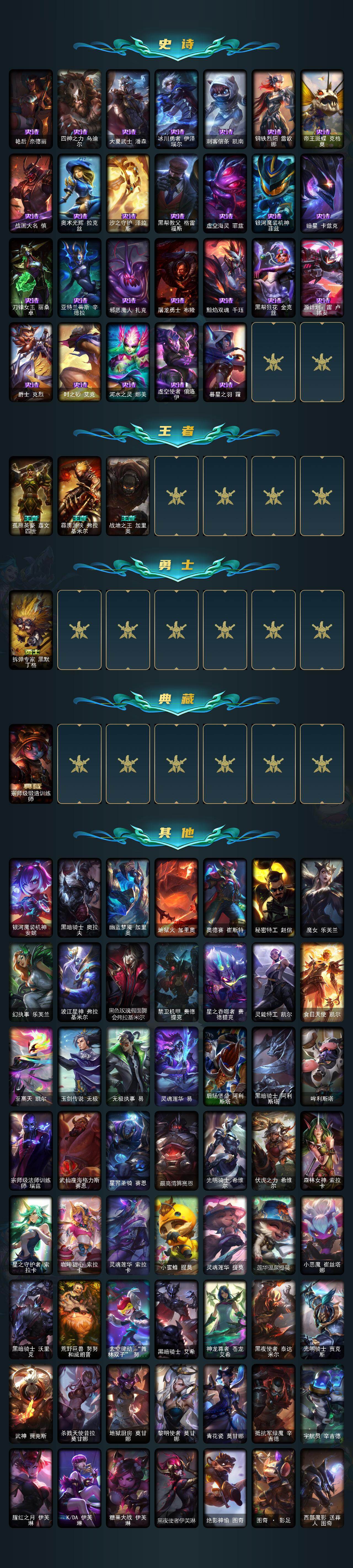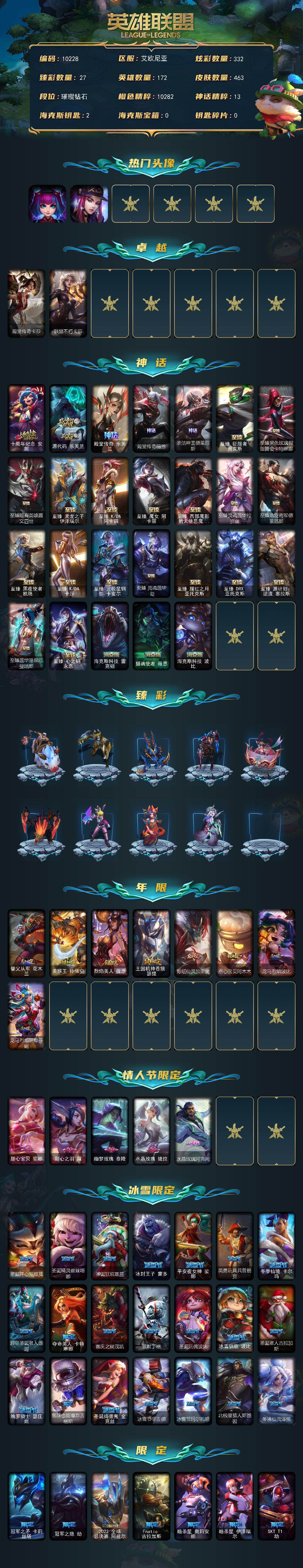 【神话皮肤】:十周年纪念安妮,源代码乐芙兰,殿堂传奇乐芙兰,殿堂传奇薇恩,圣洁神王德莱厄斯