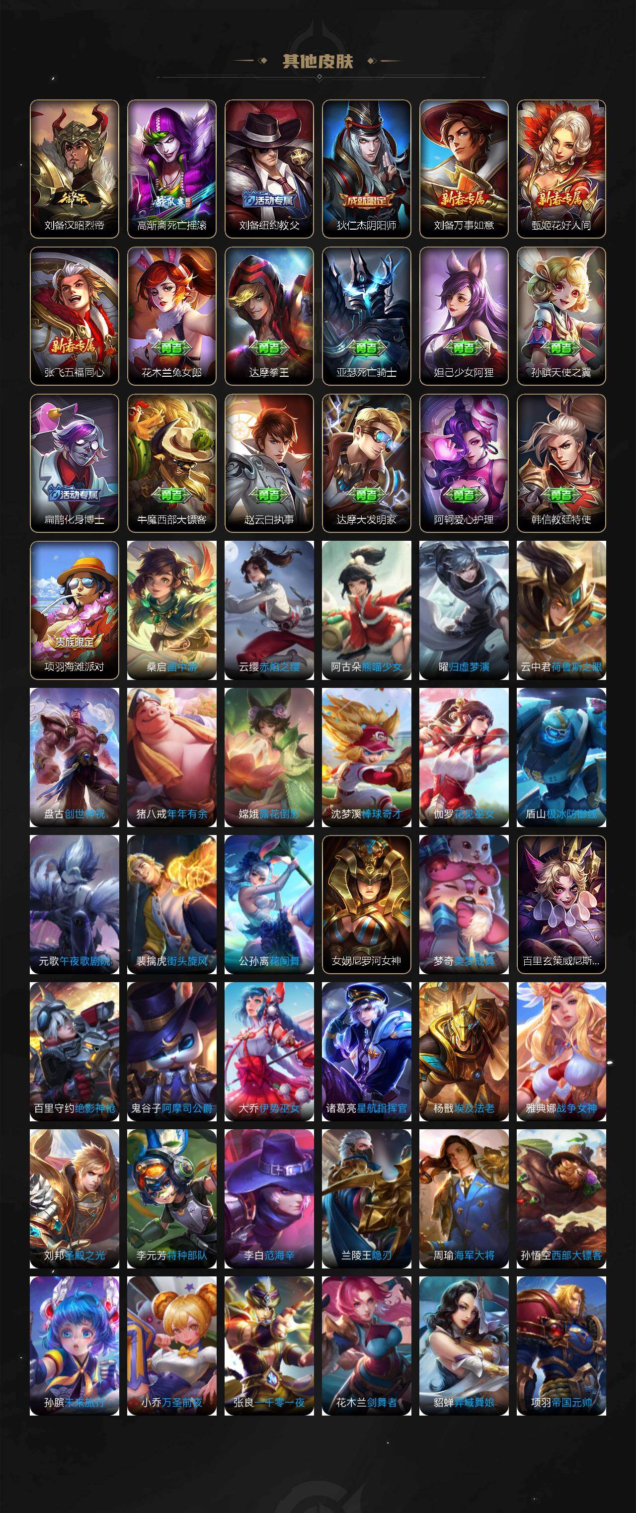 【限定皮肤】:白起狰,狄仁杰阴阳师,虞姬凯尔特女王,赵云皇家上将,高渐离死亡摇滚,扁鹊炼金王,芈月重明,元歌云间偶戏,夏侯惇朔风刀,曹操烛龙,典韦穷奇,狄仁杰魔术师,狄仁杰万华元夜,达摩沙漠行僧,