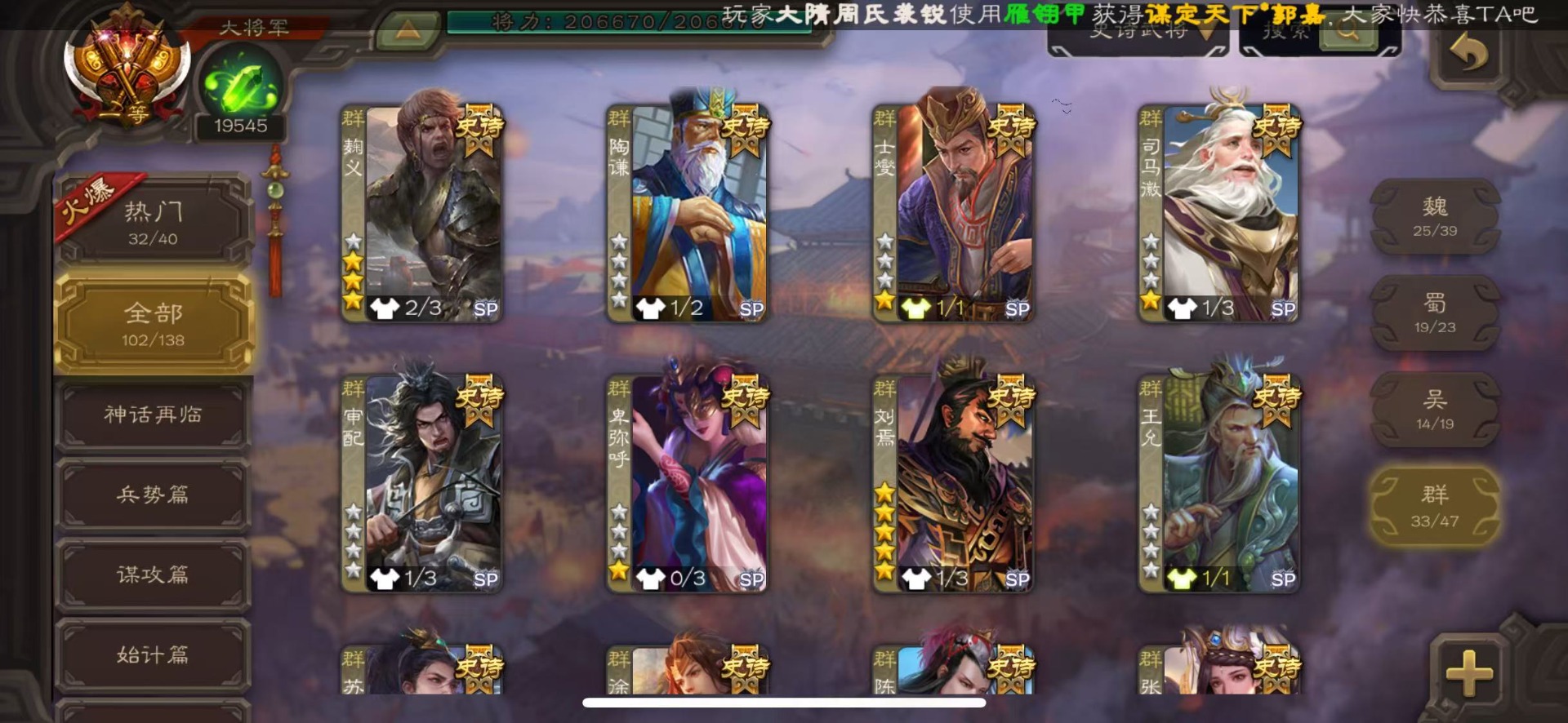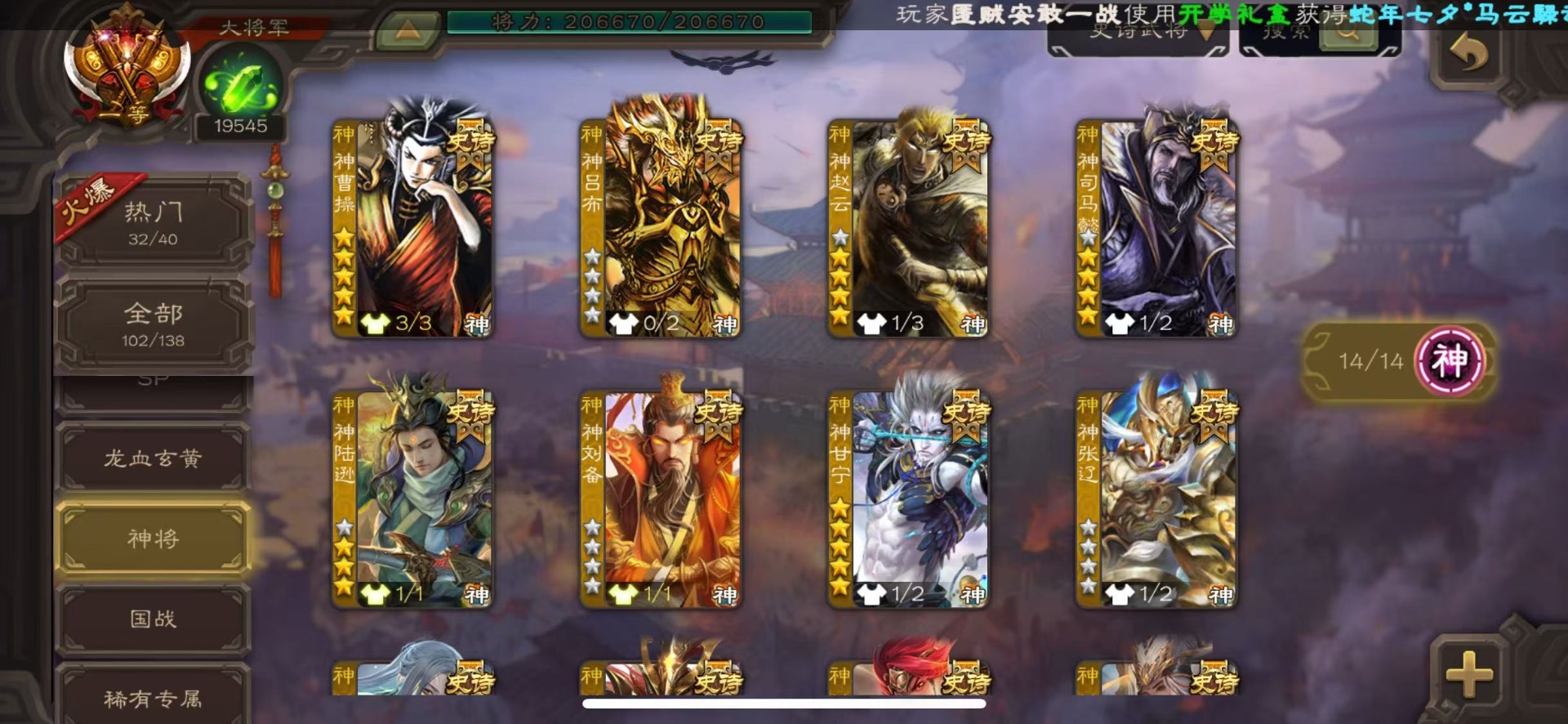 [16677419]VIP16 大将军 496武将 87动态皮肤 102史诗武
