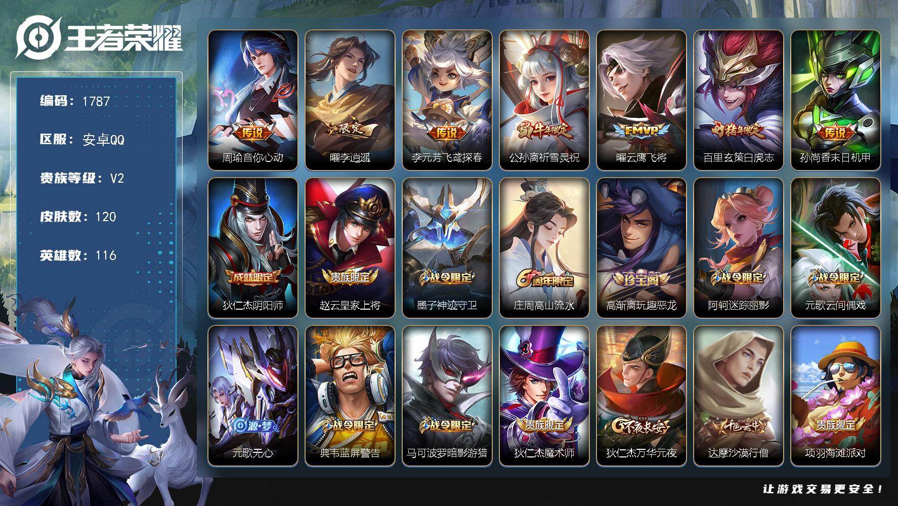 水晶210抽李逍遥+白虎志 2836374 王者荣耀账号 安卓Q-V2-永恒钻石II段位-116英雄-120皮肤-7传说-41史诗