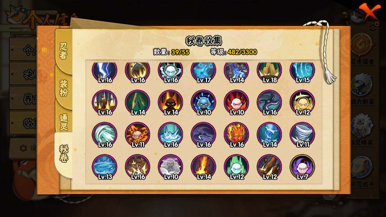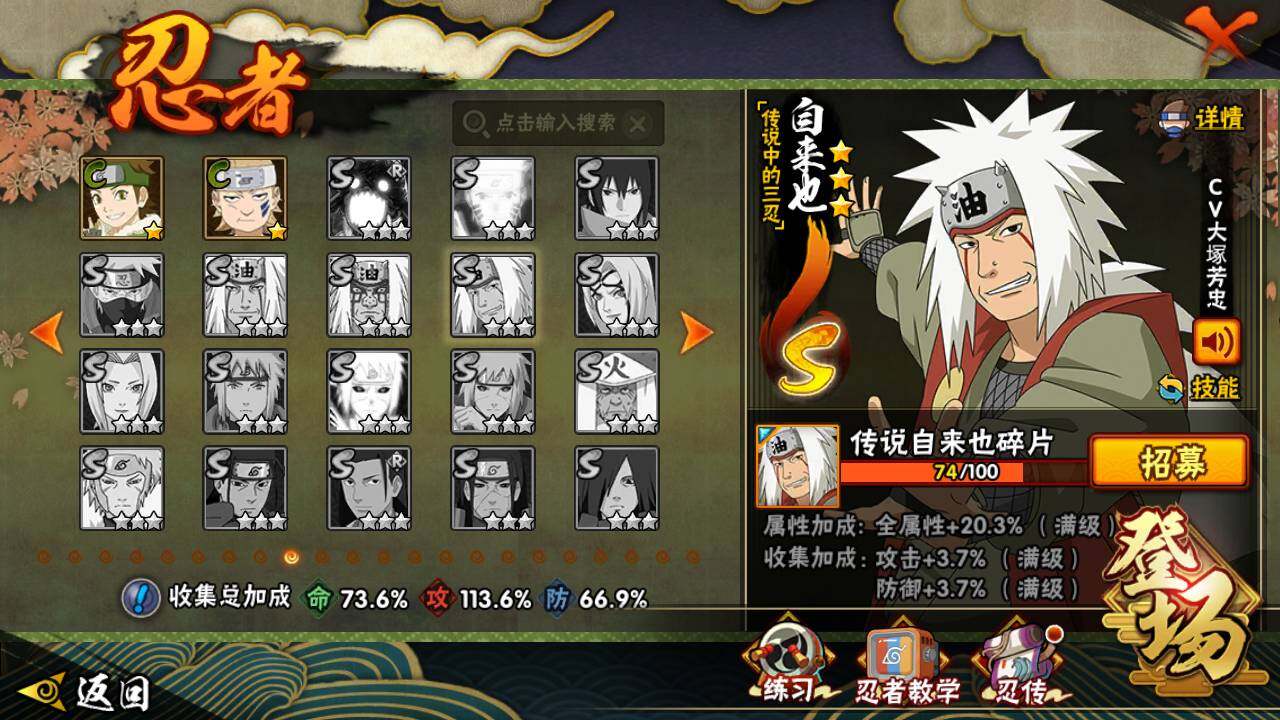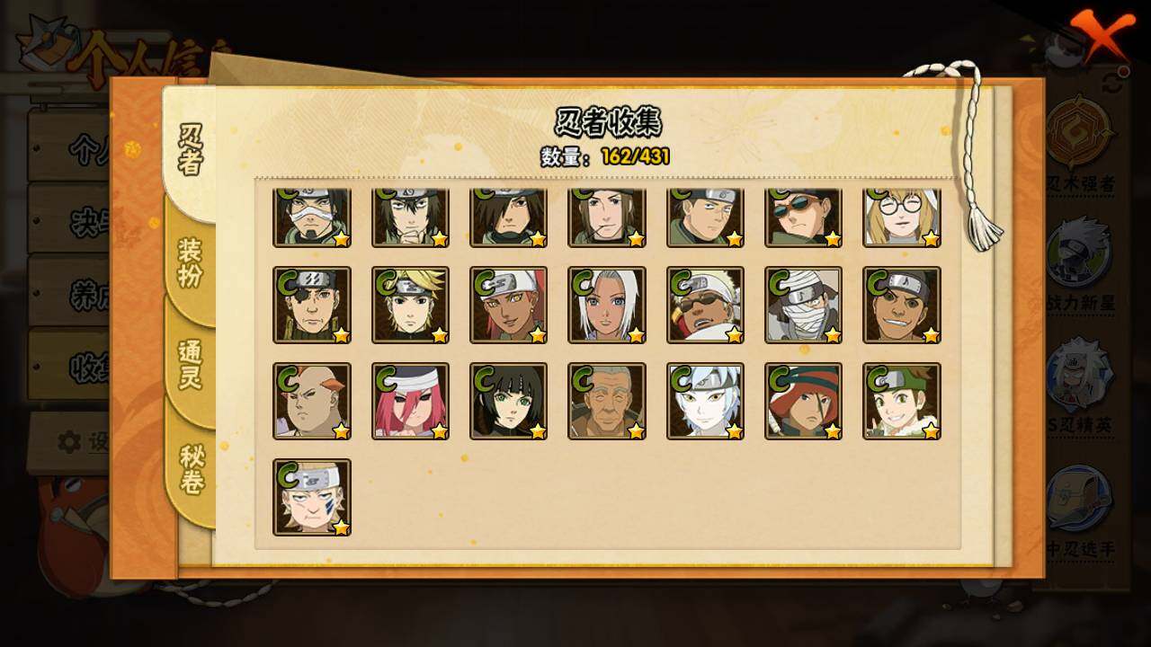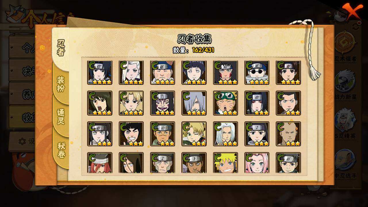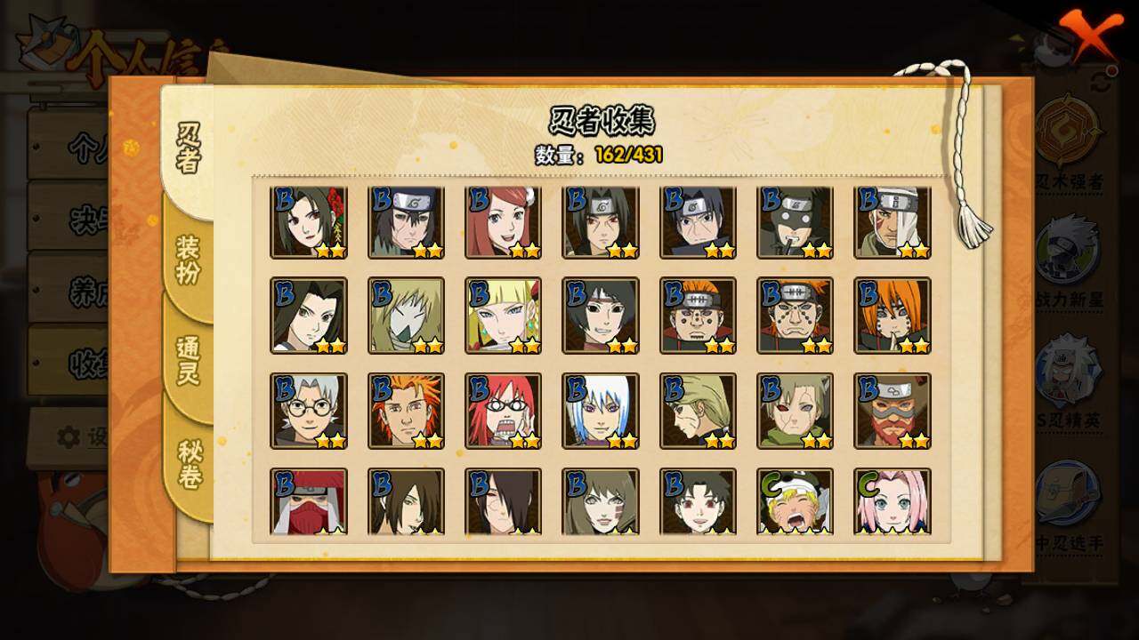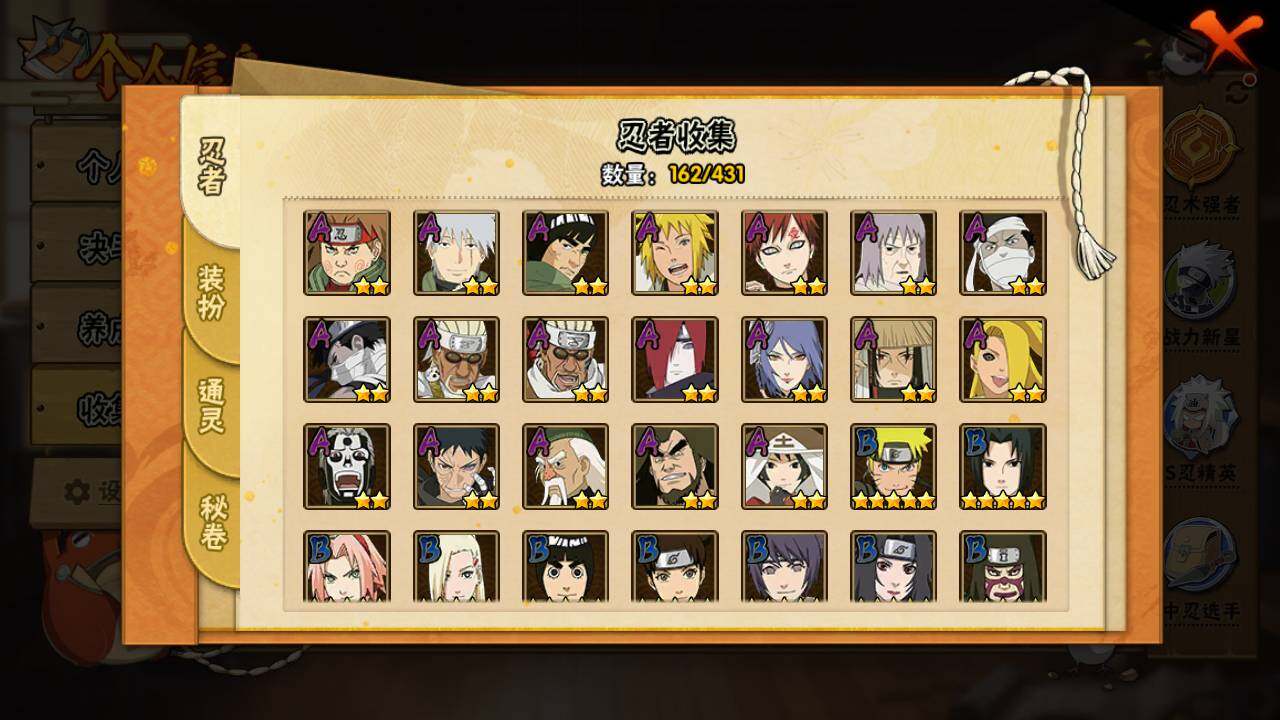 【S级忍者】:猿飞日斩「秽土转生」(3星),千手扉间「秽土转生」(3星),宇智波鼬「秽土转生」(3星),宇智波斑「秽土转生」(3星),春野樱「忍界大战」(3星),宇智波带土「忍界大战」(3星),宇智波鼬「须佐能乎」(3星),艾「三代目雷影」(3星),自来也「舞之豪杰」(3星),大蛇丸(3星),药