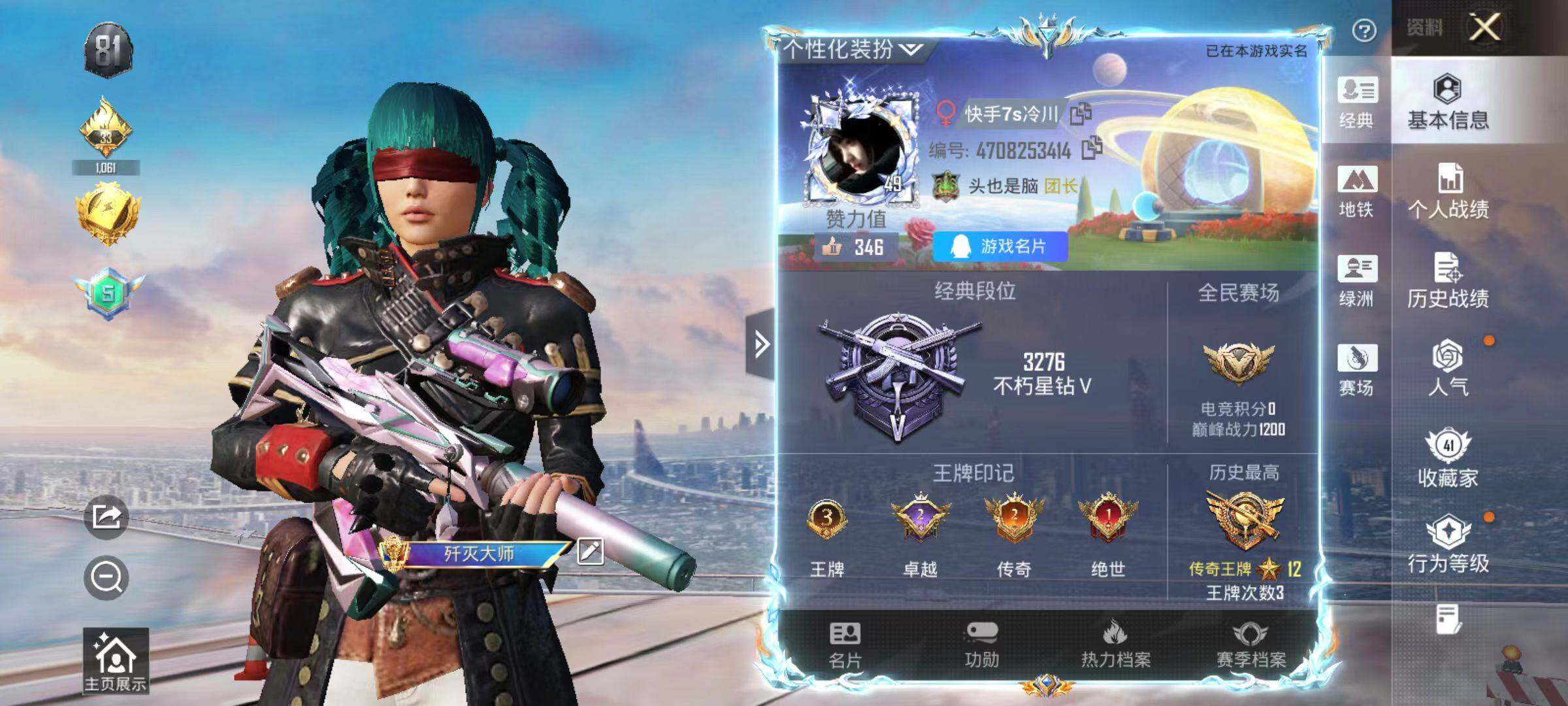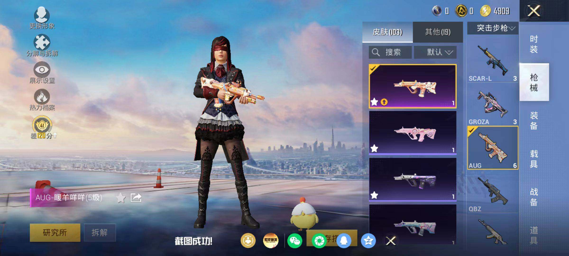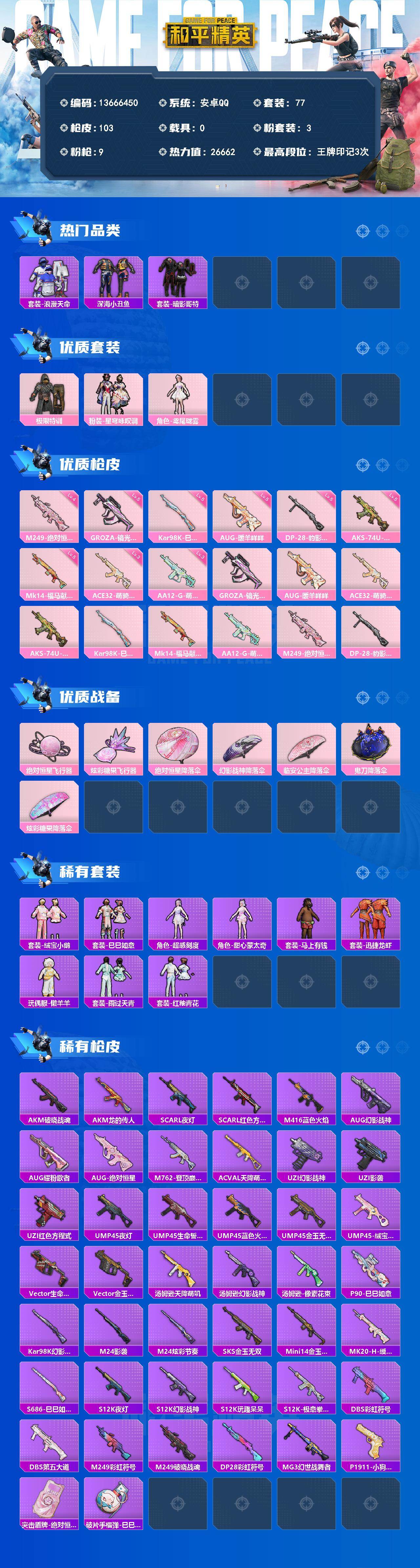 粉装3/粉枪9/珍稀飞行器123373,130245/套装77/枪皮103/热力值26662/历史最高段位:王牌印记3次/Lv:49/五级GROZA-镜光银凌/五级AUG-暖羊咩咩/三级ACE32-萌骑漫游/五级AKS-74U-森灵之息/五级Kar98K-巳巳如意/五级Mk14-福马献瑞/三级AA12-G-萌骑幻想/四级M249-绝对恒星/五级DP-28-豹影疾电/套装-浪漫天命/深海小丑鱼/套