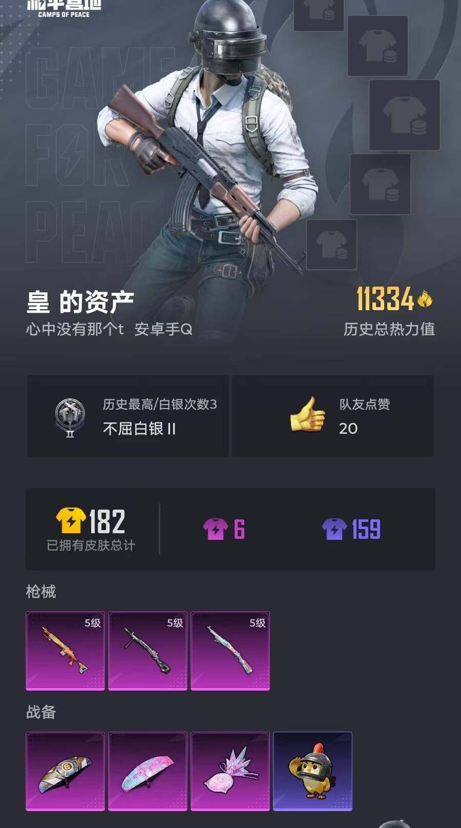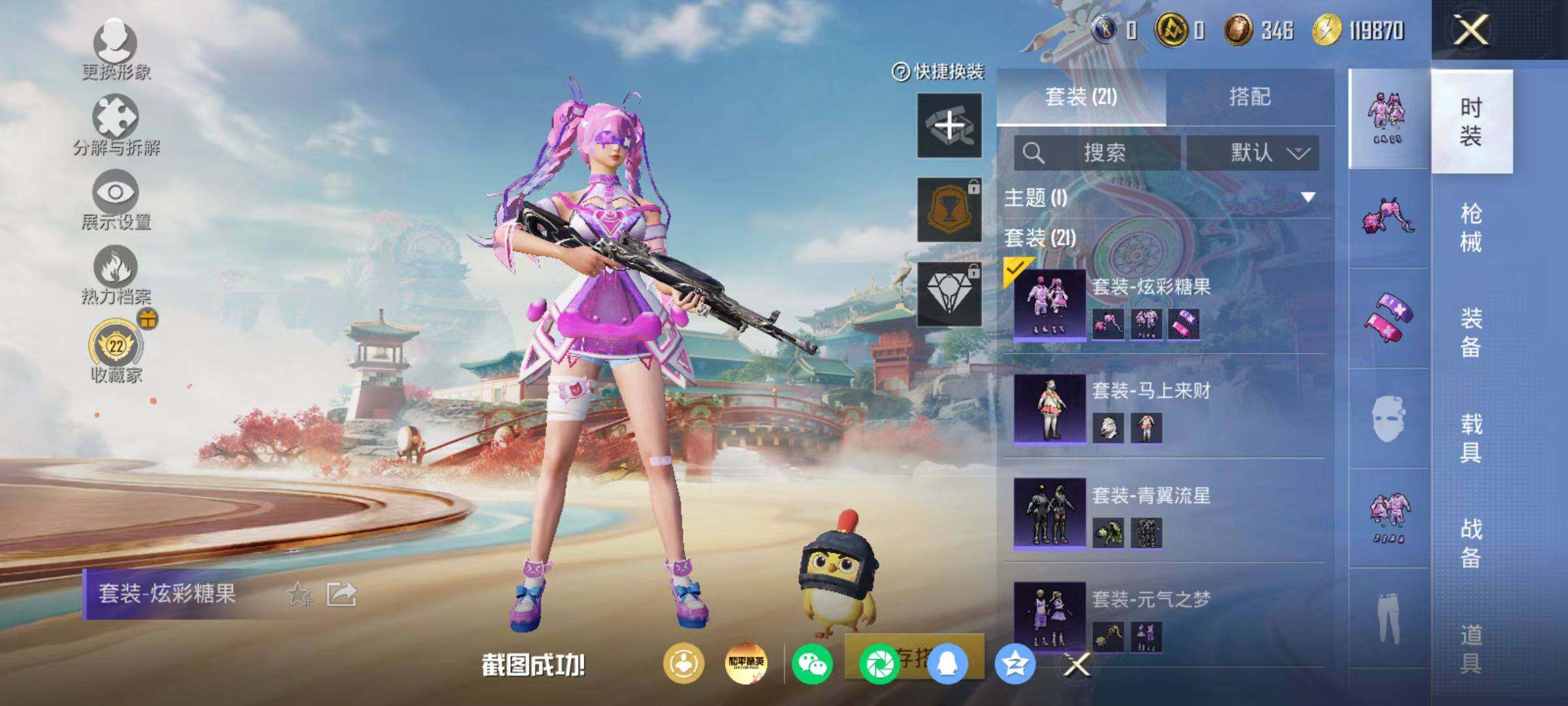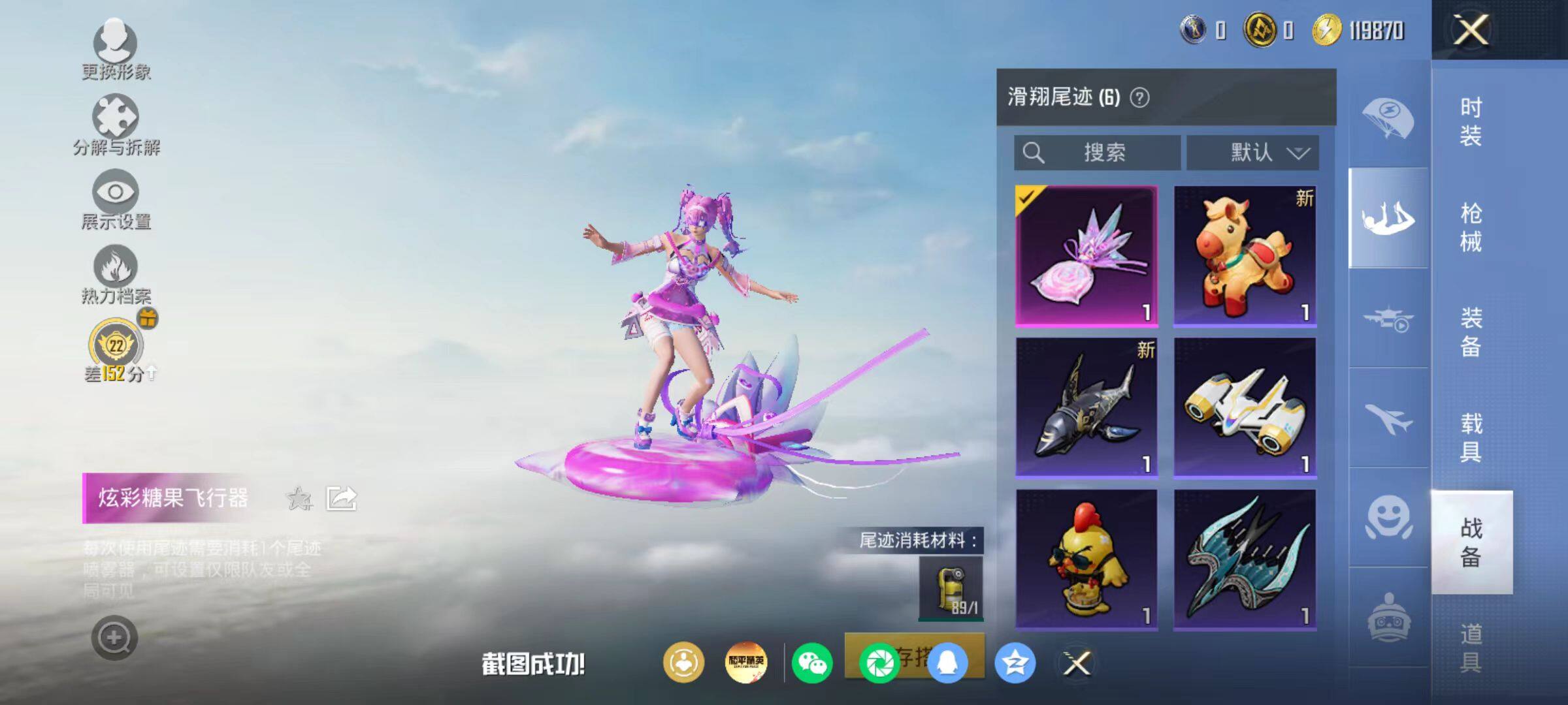 粉枪3/珍稀飞行器130245/套装21/枪皮55/热力值11334/历史最高段位:王牌印记0次/Lv:17/五级Kar98K-巳巳如意/五级Mk14-福马献瑞/五级DP-28-豹影疾电/Kar98K-巳巳如意/Mk14-福马献瑞/DP-28-豹影疾电/炫彩糖果飞行器/极意拳锋降落伞/炫彩糖果降落伞/套装-雪国风尚/套装-炫彩糖果/套装-马上来财/套装-迅捷龙虾/AUG-冰晶雪宝/AKM-龙的传