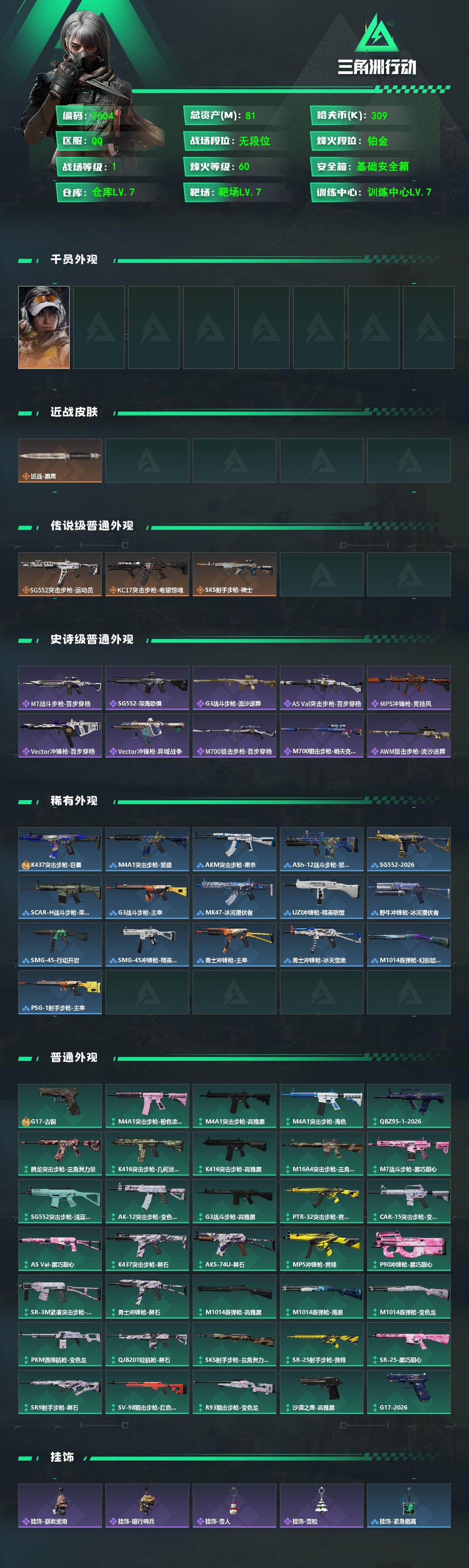 {特价出售}等级:60 总资产:81.3M 纯币309140 红皮:金牌射手 特勤处:仓库7,训练7,靶场7