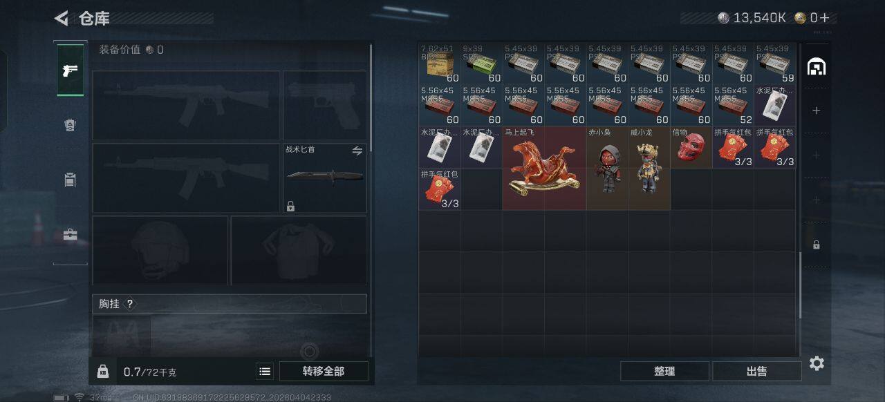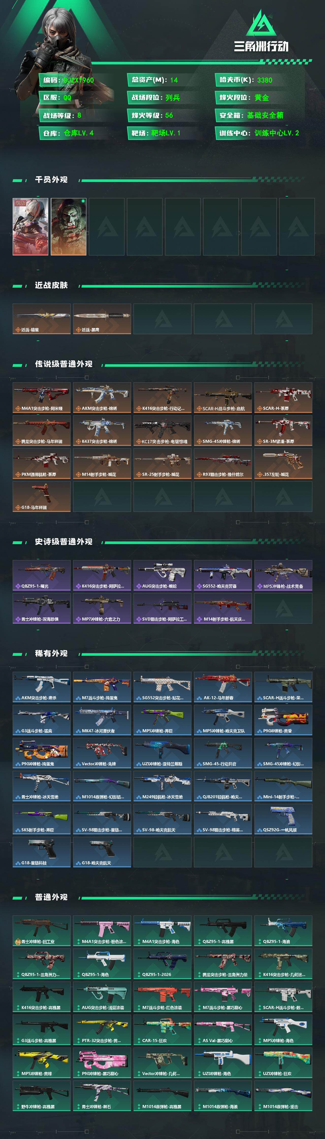 【SJZX1960】总资产(M):14M/哈夫币(K):3380K/哈夫币(K):3380K/传说枪皮数:16/全面战场等级:8_段位:列兵/烽火地带等级:56_段位:黄金/骇爪-维什戴尔/红狼-电锯惊魂/近战-暗星/近战-黑鹰/M4A1突击步枪-阿米娅/AKM突击步枪-锦绣/K416突击步枪-行动记录/SCAR-H战斗步枪-启航/SCAR-H战斗步枪-荼蘼/腾龙突击步枪-马年祥瑞/K437突击