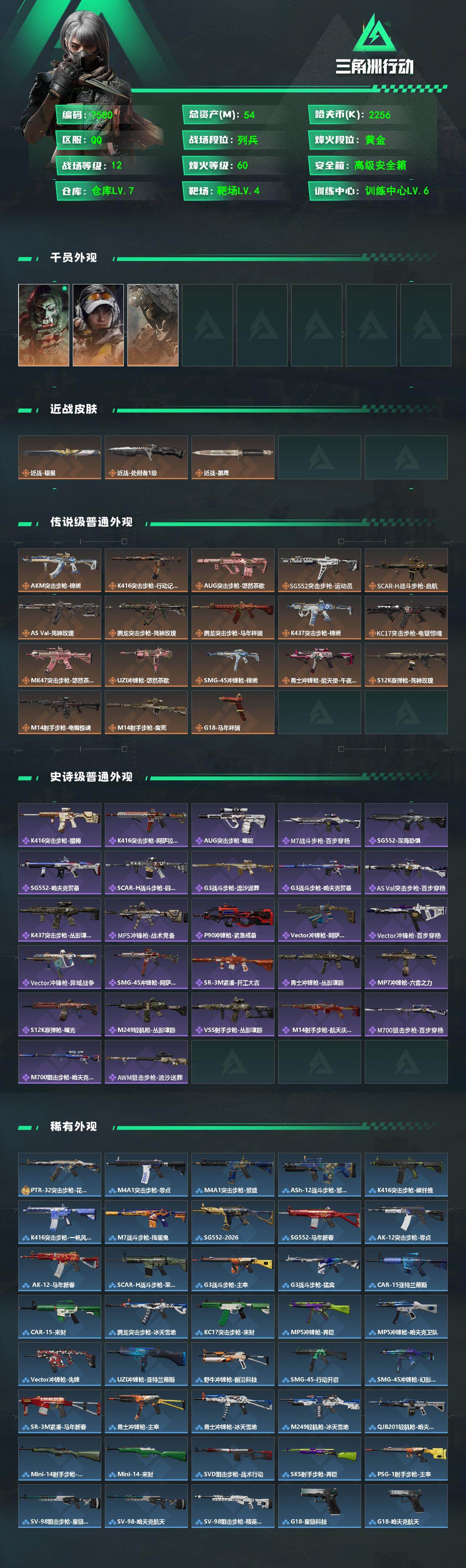 {特价出售}等级:60总资产:54.5M 纯币2256K 红皮:乌鲁鲁-荒原猎手/露娜-金牌射手/红狼-电锯惊魂 刀皮: 近战-暗星/近战-处刑者 特勤处:仓库7,训练6,靶场4