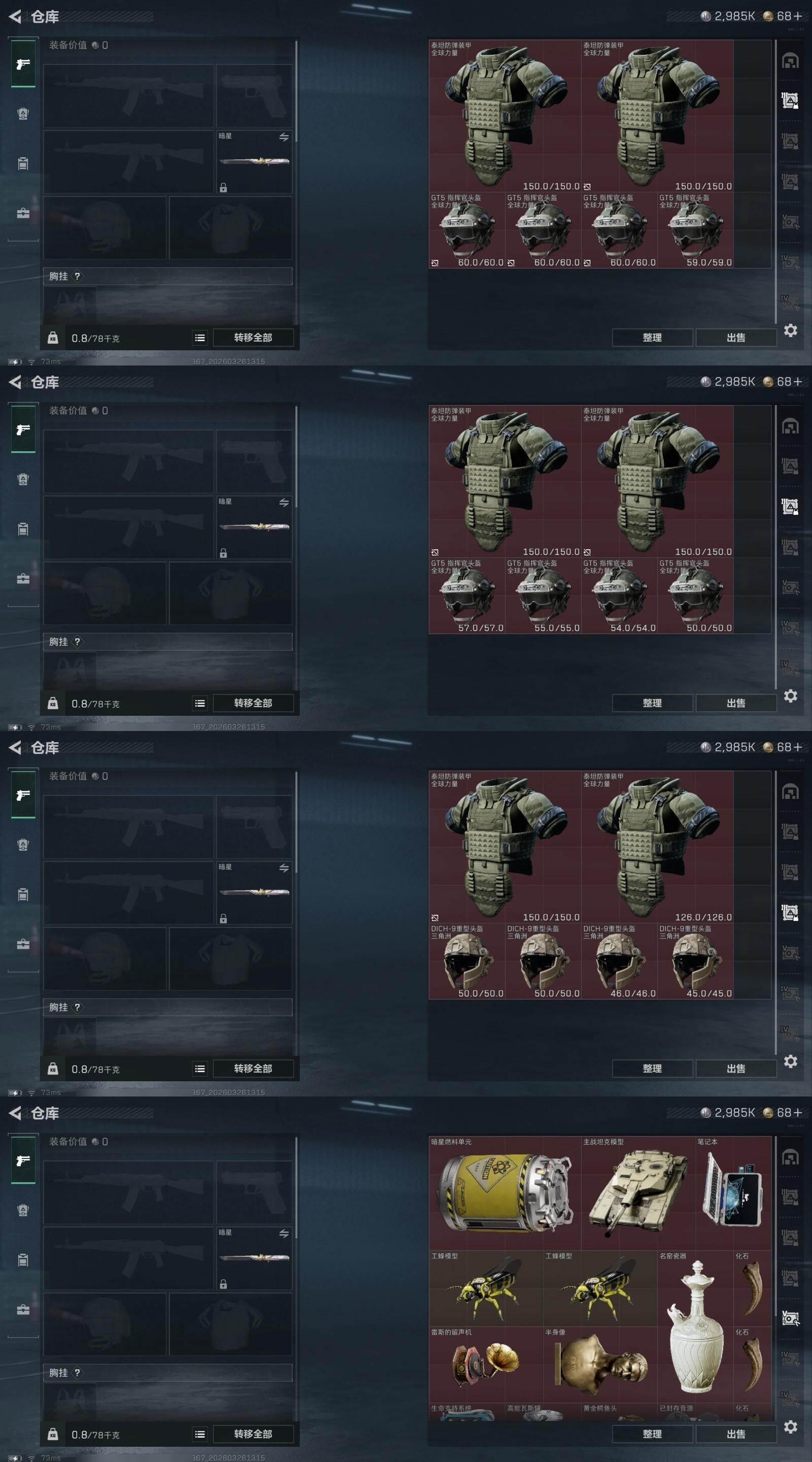 【2857】总资产(M):144M/哈夫币(K):2985K/哈夫币(K):2985K/全面战场等级:50_段位:尉官/烽火地带等级:60_段位:黑鹰/露娜-金牌射手/近战-暗星/近战-处刑者1级/近战-黑鹰/SG552突击步枪-点翠/KC17突击步枪-点翠/PSG-1射手步枪-点翠/腾龙突击步枪-马年祥瑞/G18-马年祥瑞/腾龙突击步枪-万金泪冠/K416突击步枪-行动记录/M14射手步枪-缄