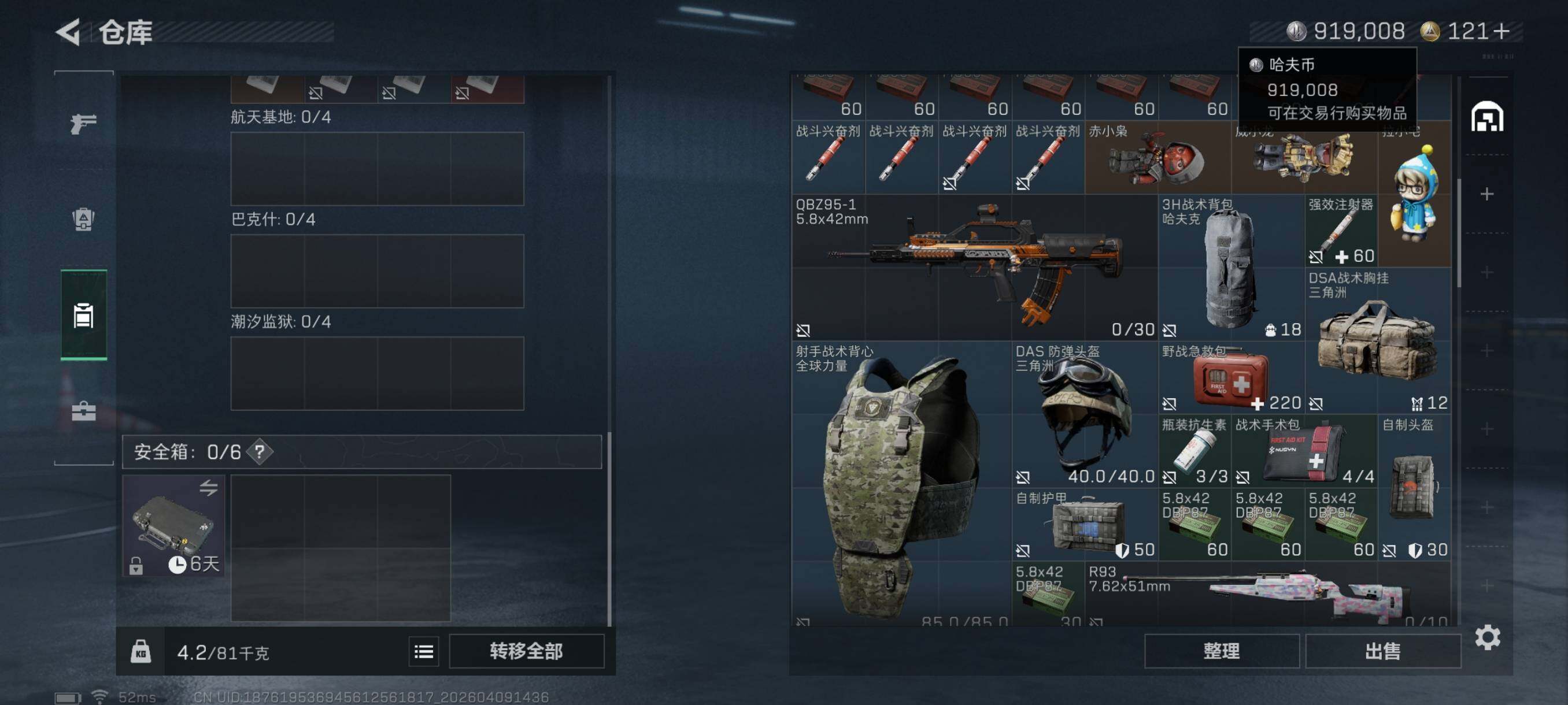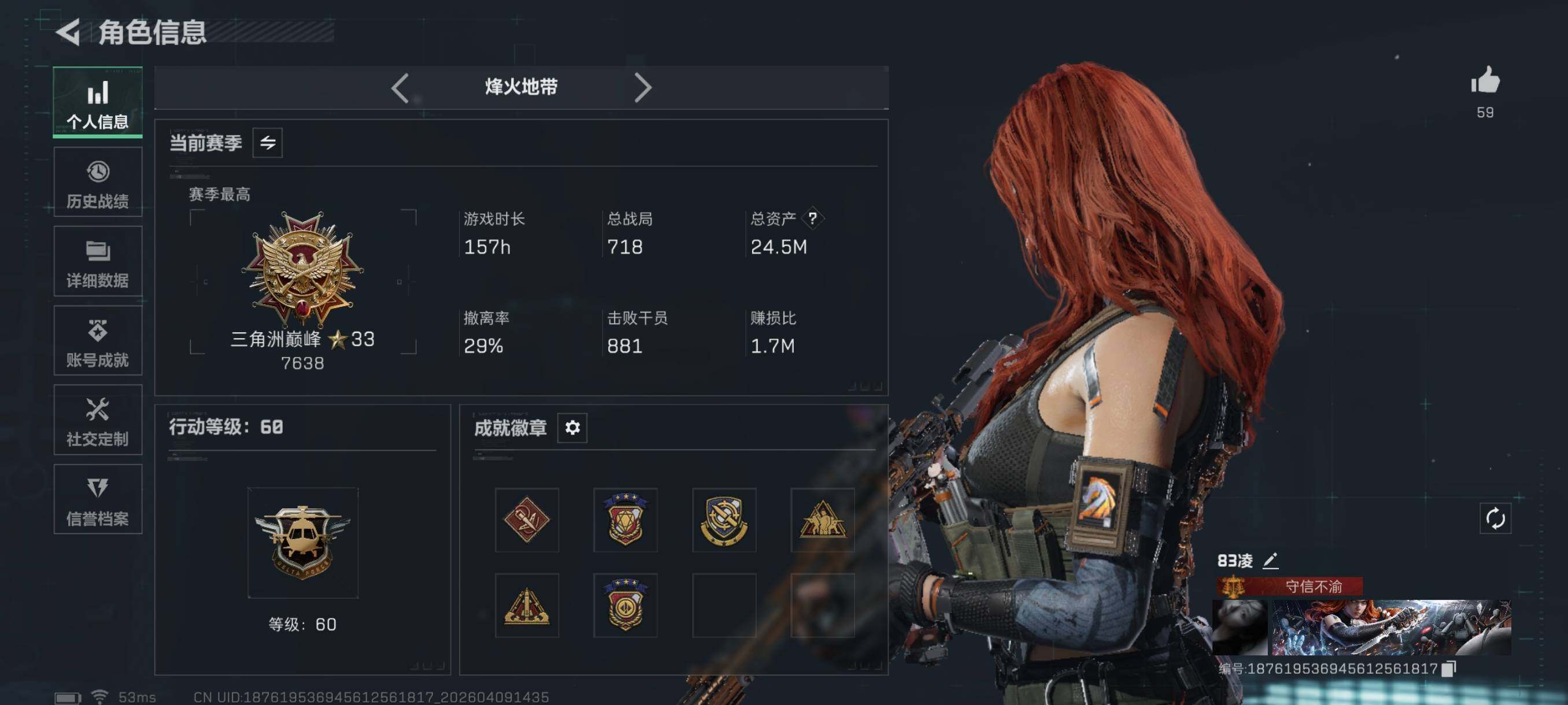 {特价出售}等级: 60 总资产:24.5M 流动资产: 10.3 M 纯币:919008 隐藏挂饰:1S肘击王 战令皮肤:乌鲁鲁-荒原猎手/露娜-金牌射手/红狼-电锯惊魂/深蓝-不破誓约 刀皮:近战-信条 砖皮:AS Val突击步枪-悬赏令(优品C) 特勤处:仓库7,训练6,靶场5