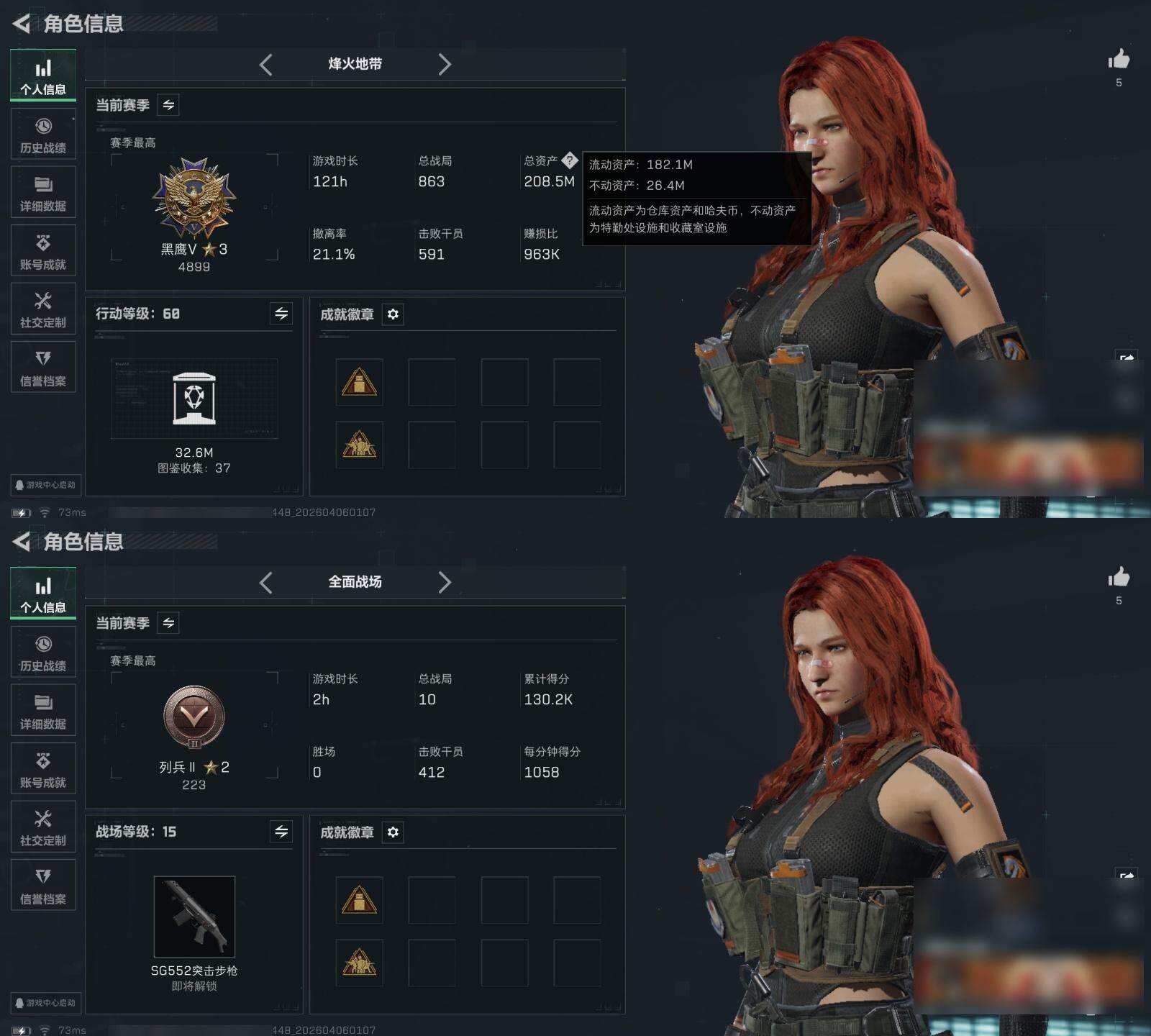 【2982】总资产(M):208M/哈夫币(K):9764K/哈夫币(K):9764K/全面战场等级:15_段位:列兵/烽火地带等级:60_段位:黑鹰/乌鲁鲁-荒原猎手/近战-暗星/近战-黑鹰/QBZ95-1突击步枪-腾驹驰春/SMG-45冲锋枪-腾驹驰春/M14射手步枪-蛮荒/腾龙突击步枪-马年祥瑞/G18-马年祥瑞/SCAR-H战斗步枪-荼蘼/PKM通用机枪-荼蘼/M14射手步枪-缄花/SR
