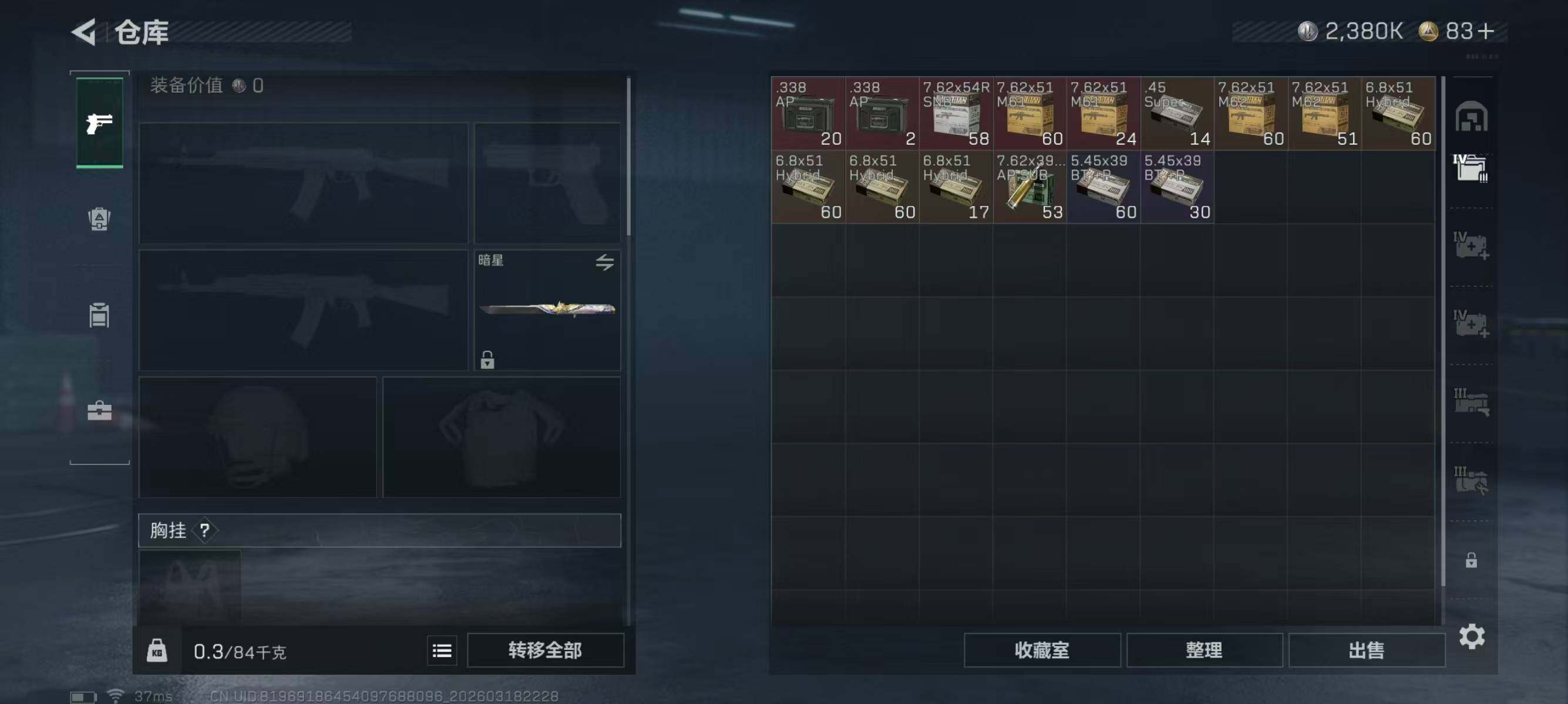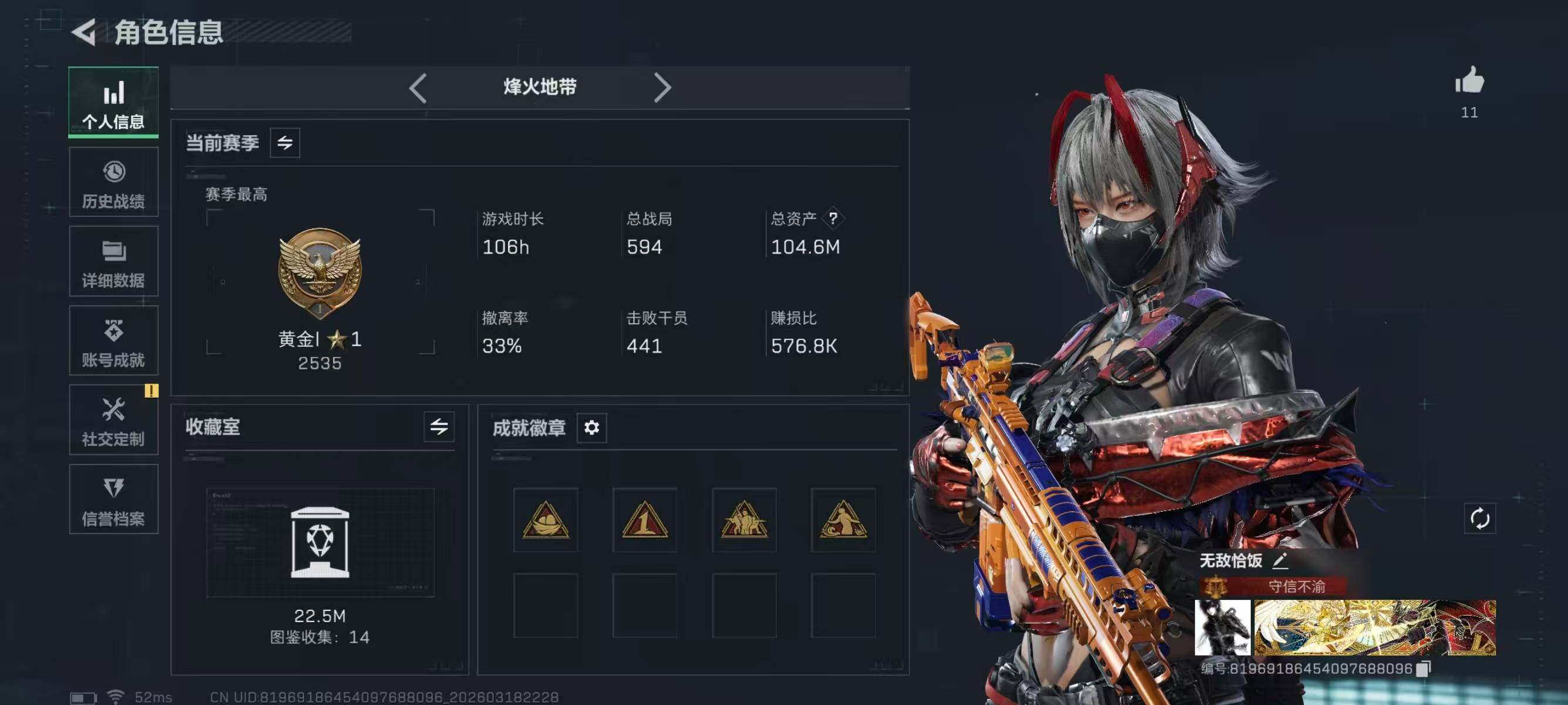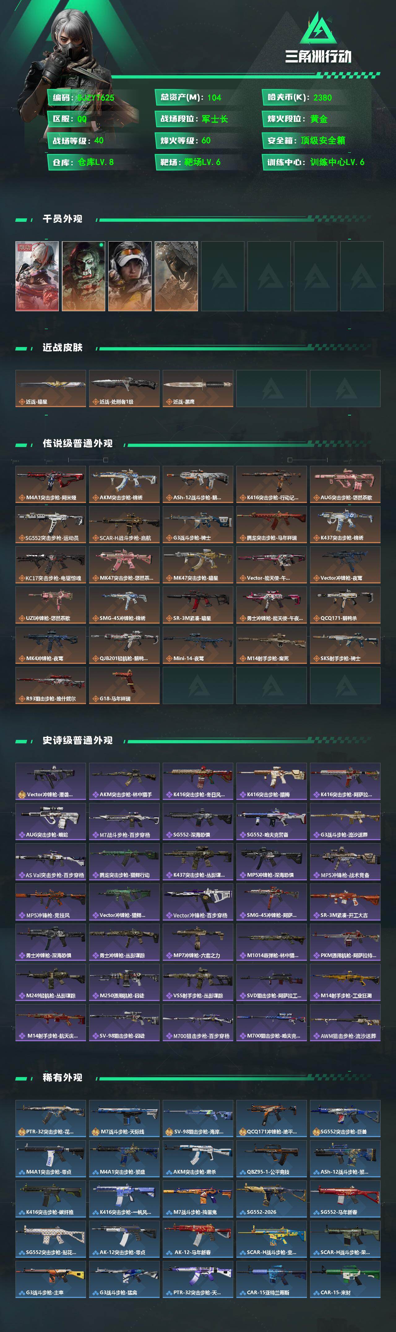 【SJZYT625】总资产(M):104M/哈夫币(K):2380K/哈夫币(K):2380K/传说枪皮数:27/全面战场等级:40_段位:军士长/烽火地带等级:60_段位:黄金/骇爪-维什戴尔/红狼-电锯惊魂/露娜-金牌射手/乌鲁鲁-荒原猎手/近战-暗星/近战-处刑者1级/近战-黑鹰/M4A1突击步枪-阿米娅/AKM突击步枪-锦绣/ASh-12战斗步枪-鹅鸭杀/K416突击步枪-行动记录/AU