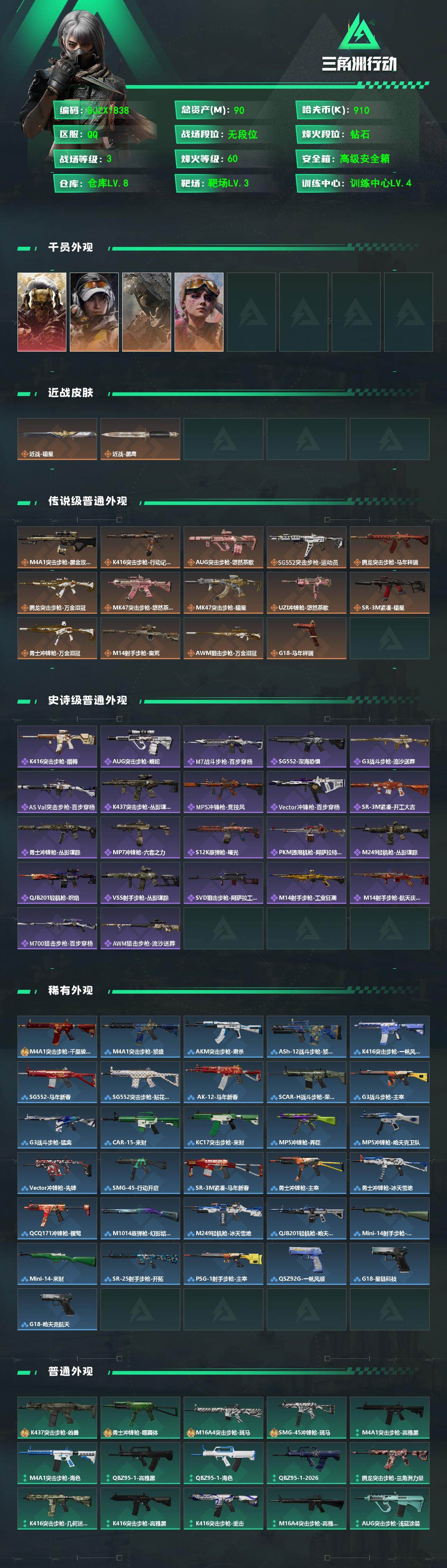 【SJZX1838】总资产(M):90M/哈夫币(K):910K/哈夫币(K):910K/传说枪皮数:14/全面战场等级:3_段位:无段位/烽火地带等级:60_段位:钻石/红狼-蚀金玫瑰/露娜-金牌射手/乌鲁鲁-荒原猎手/蛊-不羁人生/近战-暗星/近战-黑鹰/M4A1突击步枪-蚀金玫瑰/K416突击步枪-行动记录/AUG突击步枪-悠然茶歇/SG552突击步枪-运动员/腾龙突击步枪-马年祥瑞/腾龙