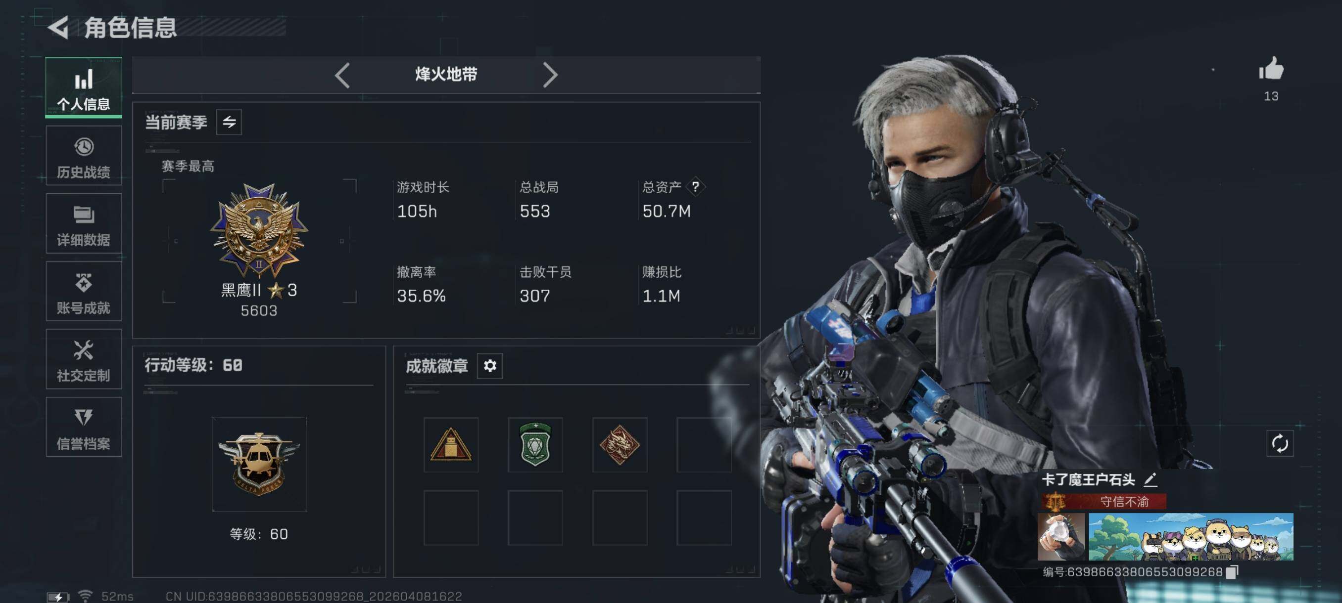 {特价出售}等级:60总资产:50.7M 纯币1200k 隐藏挂饰:余烬之影3s 红皮:无题密令 刀皮 怜悯 特勤处:仓库4,训练6,靶场4
