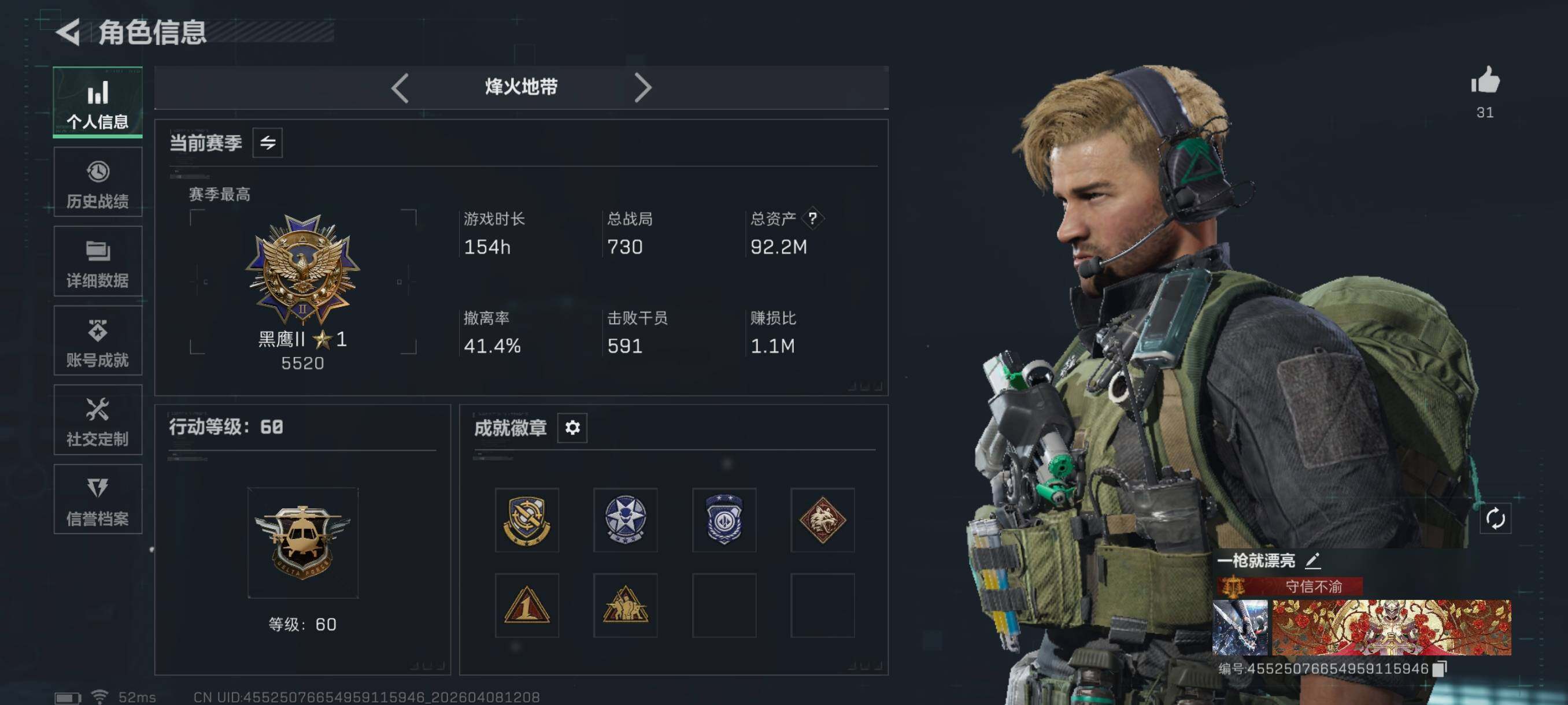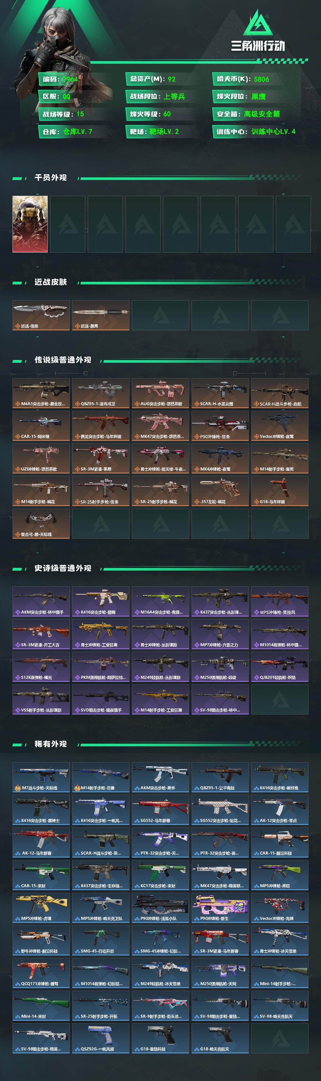 {特价出售}等级:60 总资产:92.2M 流动资产:50M 纯币5806k 隐藏挂饰: 红皮:红狼-蚀金玫瑰/乌鲁鲁-荒原猎手 刀皮:信条 特勤处:仓库7,训练4,靶场2