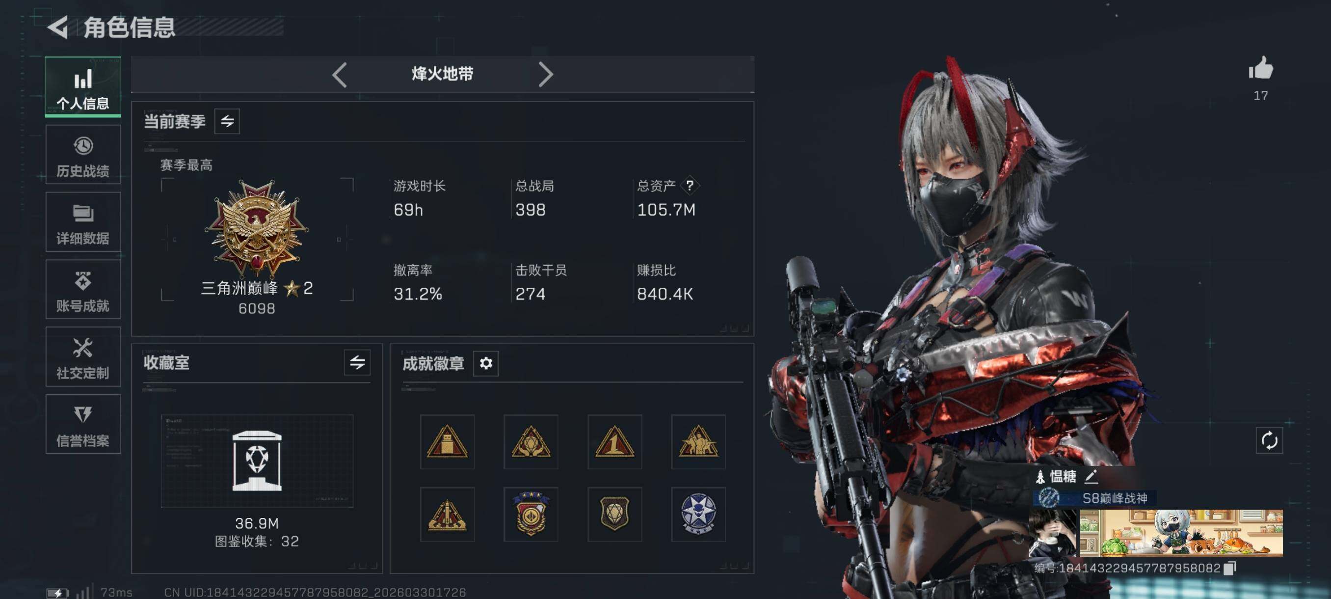 {特价出售}等级:60总资产105.7m 流动79.9m 纯币4792k 人物皮 骇爪联动 电锯惊魂 不羁人生 荒原猎手 金牌射手 刀皮 信条 特勤仓库8级 体力4级·负重3级
