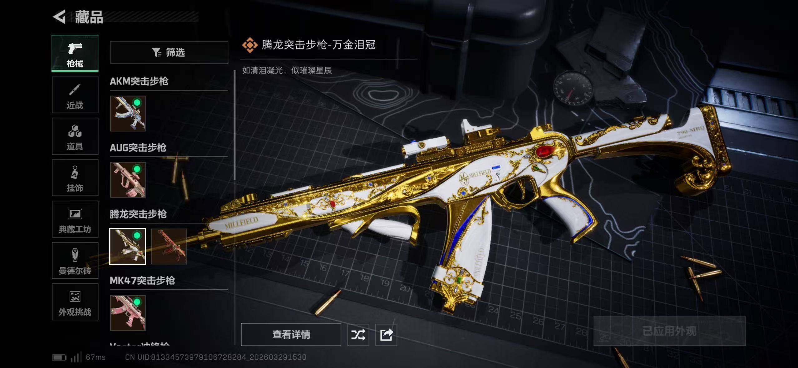 【传说外观】:AKM突击步枪-锦绣,AUG突击步枪-悠然茶歇,腾龙突击步枪-马年祥瑞,腾龙突击步枪-万金泪冠,MK47突击步枪-悠然茶歇,Vector冲锋枪-夜莺,UZI冲锋枪-悠然茶歇,勇士冲锋枪-万金泪冠,QCQ171冲锋枪-