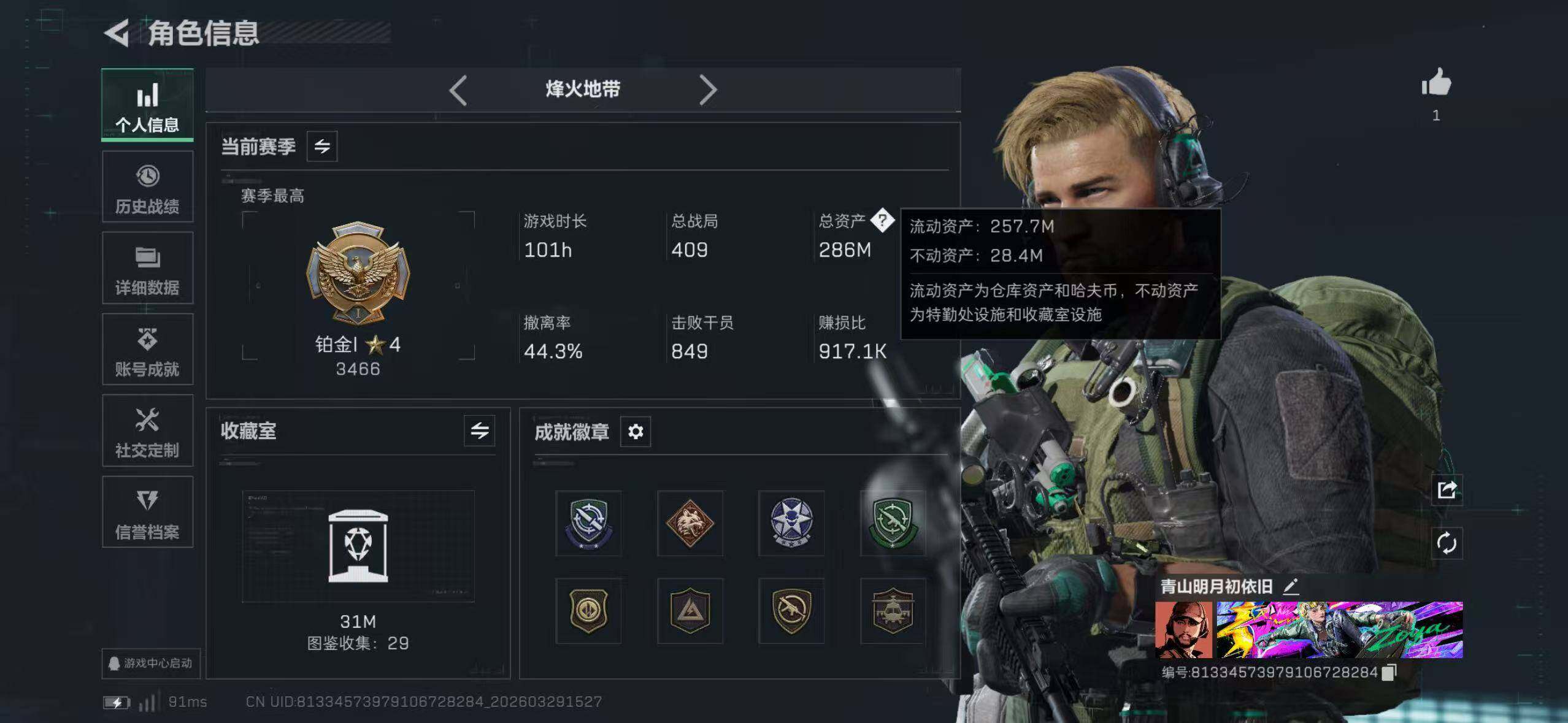 【SJ1584】283m总资产-119368k哈夫币-60烽火等级-铂金-18战场等级-上等兵