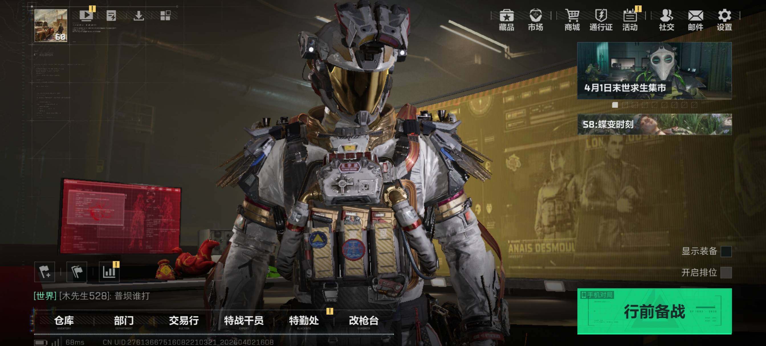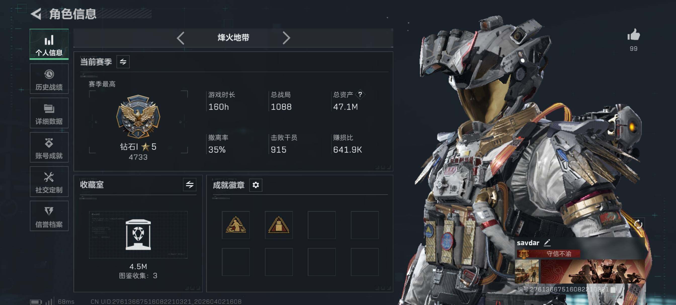 47m总资产-1557k哈夫币-60烽火等级-钻石-41战场等级-尉官