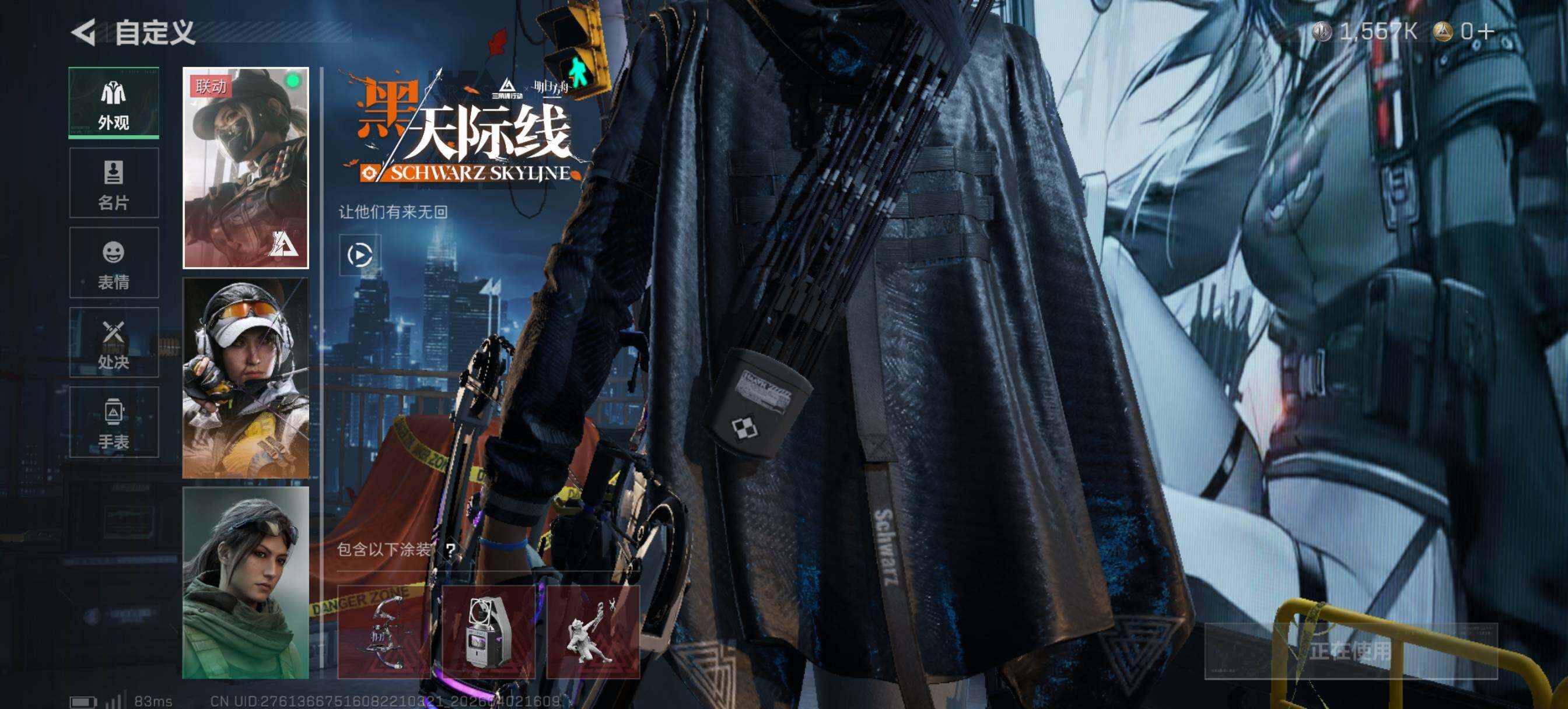 【干员外观】:露娜-黑·天际线,威龙-凌霄戍卫,蜂医-送葬人·无题密令,无名-夜鹰,红狼-电锯惊魂,露娜-金牌射手,乌鲁鲁-荒原猎手,蛊-不羁人生