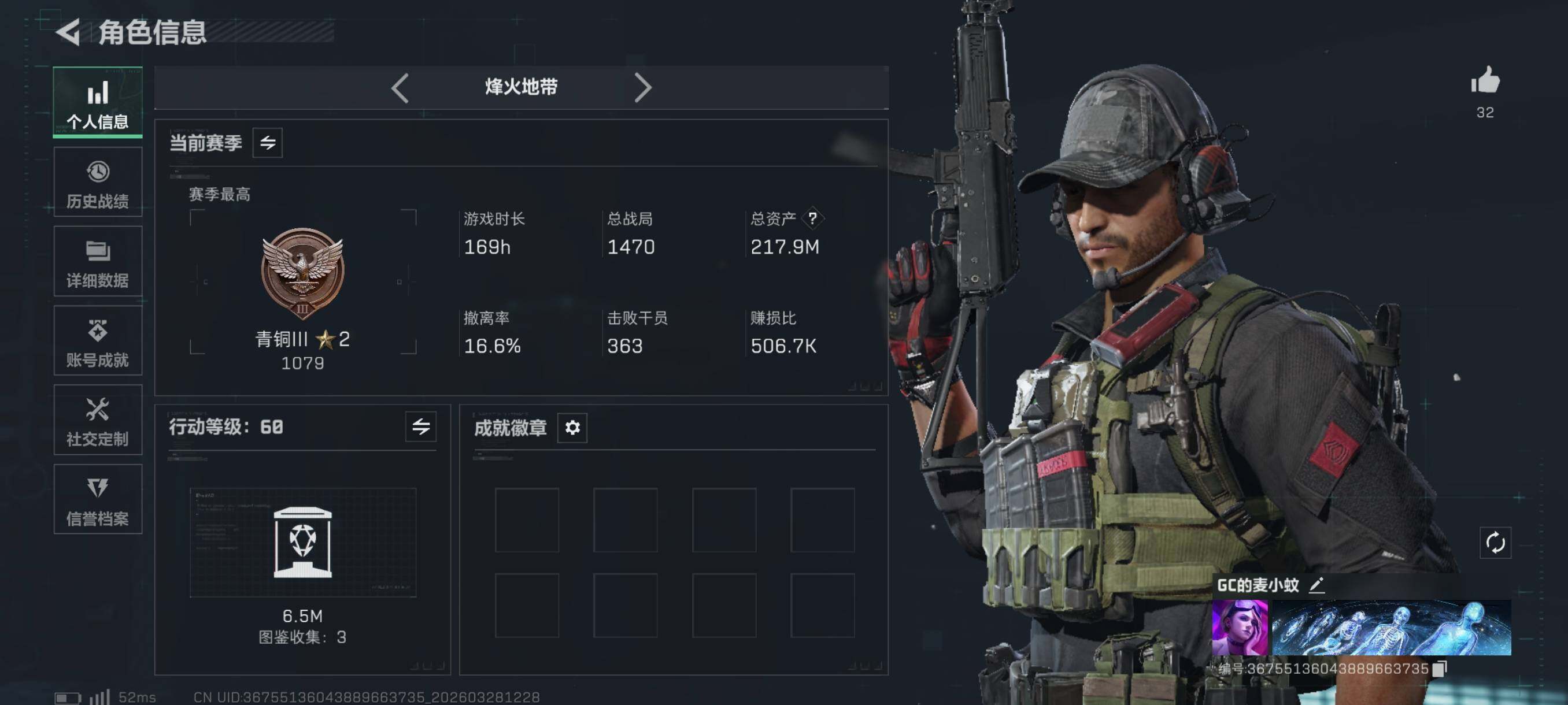 {特价出售}等级:60总资产:217.9M 纯币115m 刀皮 :暗星 特勤处:仓库9,训练7,靶场7 s8赛季九格 安全箱