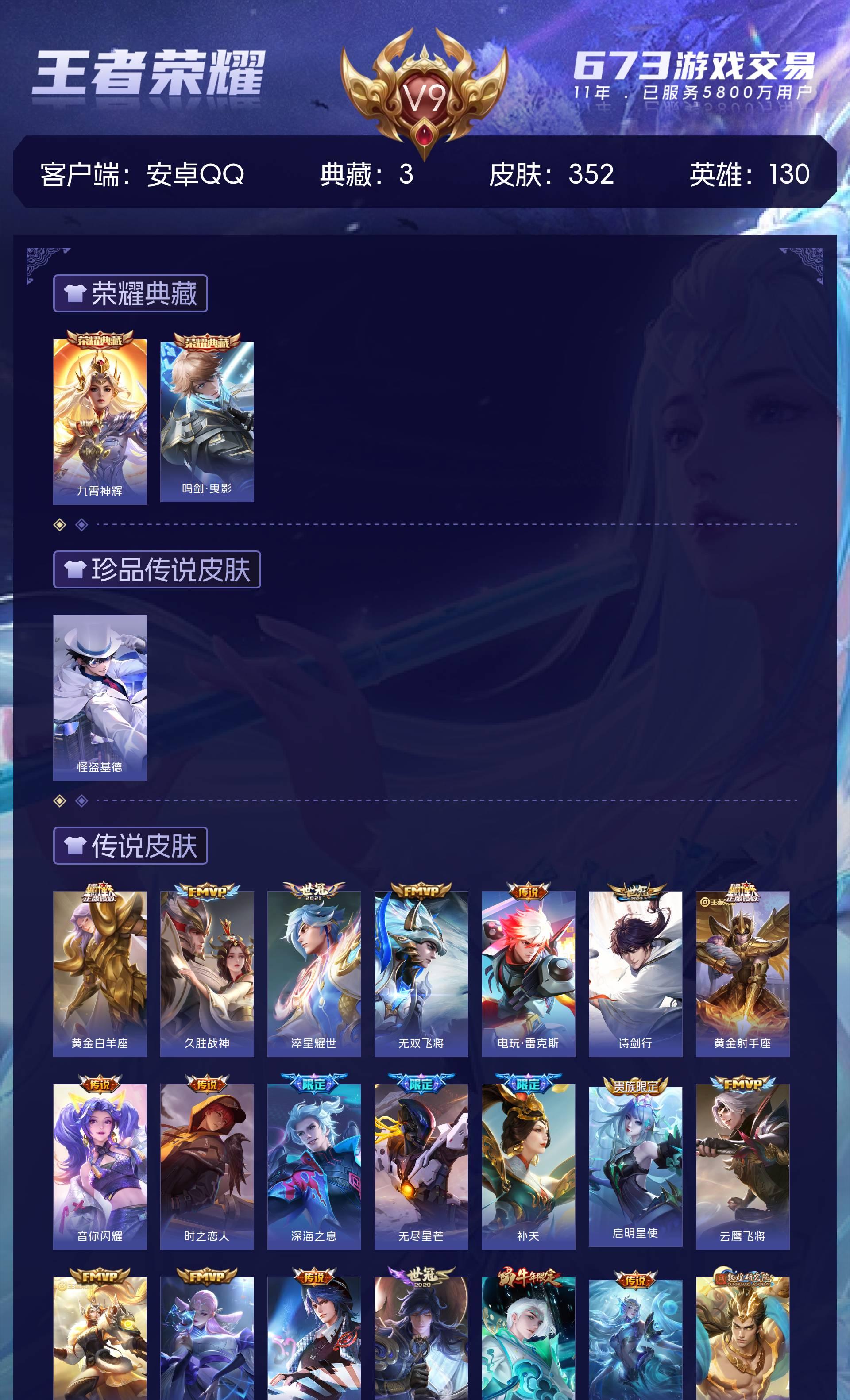 V9 皮肤352 英雄130 永恒钻石 荣耀典藏3 珍品传说1 传说30
