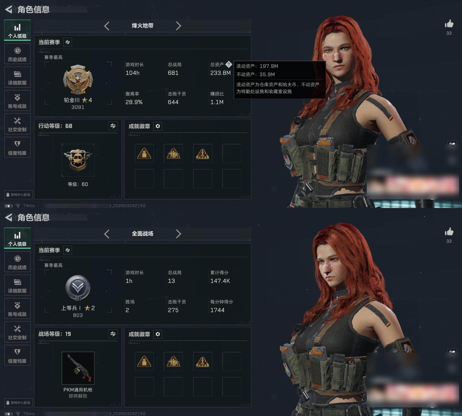 【2902】总资产(M):233M/哈夫币(K):6668K/哈夫币(K):6668K/全面战场等级:19_段位:上等兵/烽火地带等级:60_段位:铂金/红狼-电锯惊魂/露娜-金牌射手/骇爪-维什戴尔/近战-信条/近战-黑鹰/AUG突击步枪-悠然茶歇/MK47突击步枪-悠然茶歇/UZI冲锋枪-悠然茶歇/SR-3M紧凑突击步枪-荼蘼/Vector冲锋枪-夜莺/MK4冲锋枪-夜莺/Mini-14射手