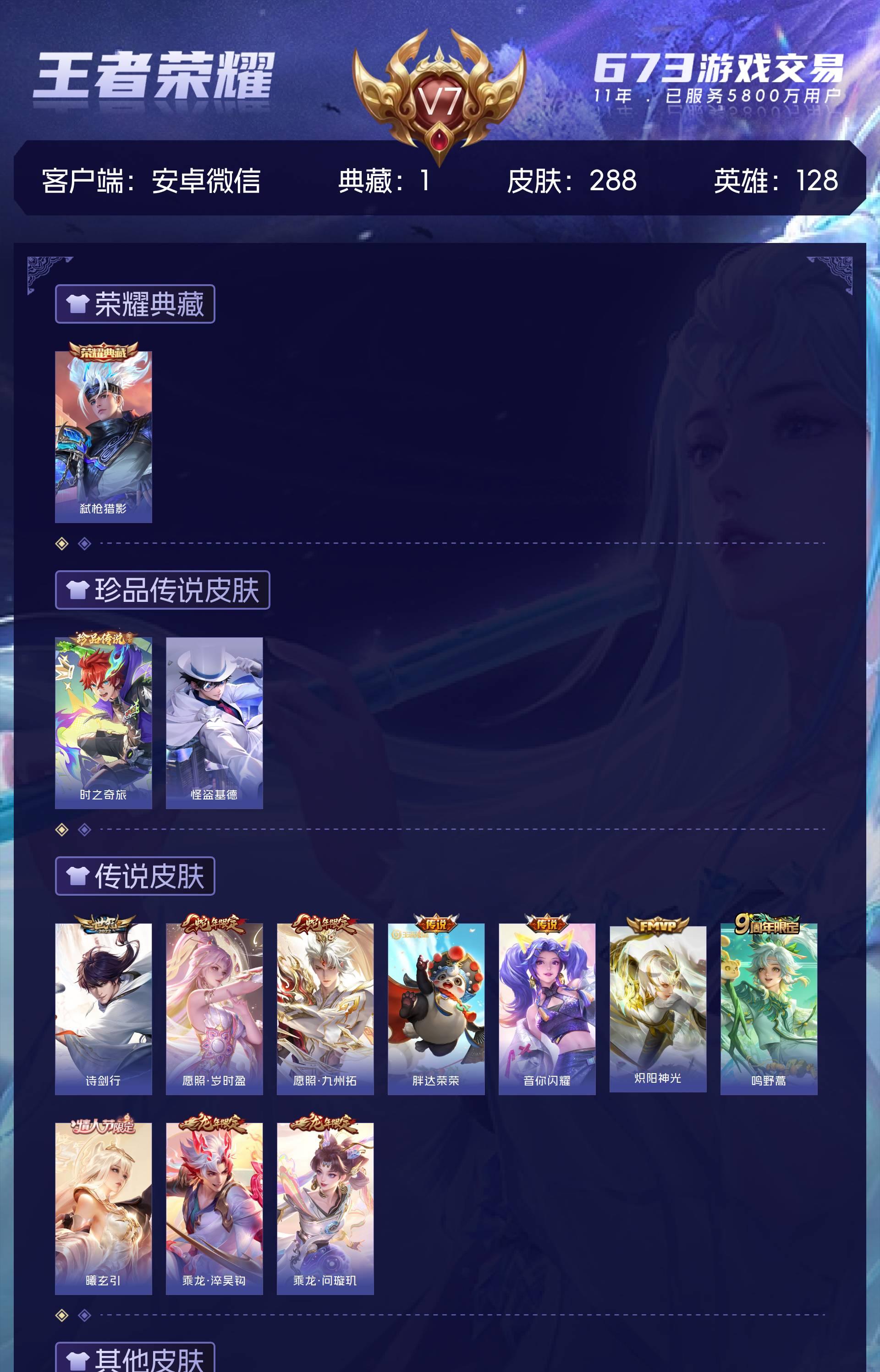 V7 皮肤288 英雄128 永恒钻石 荣耀典藏1 珍品传说2 传说10