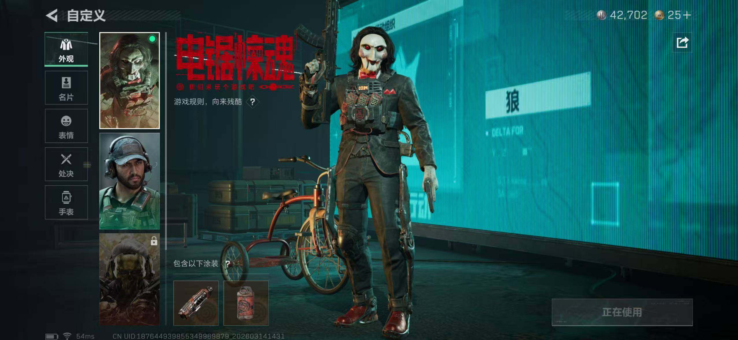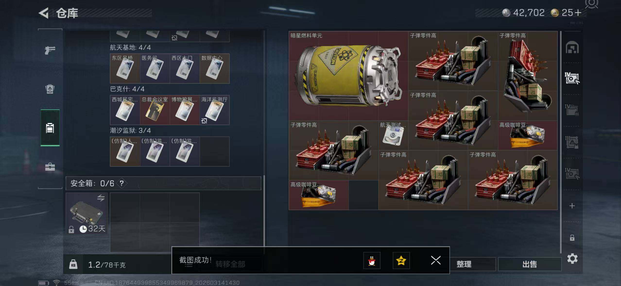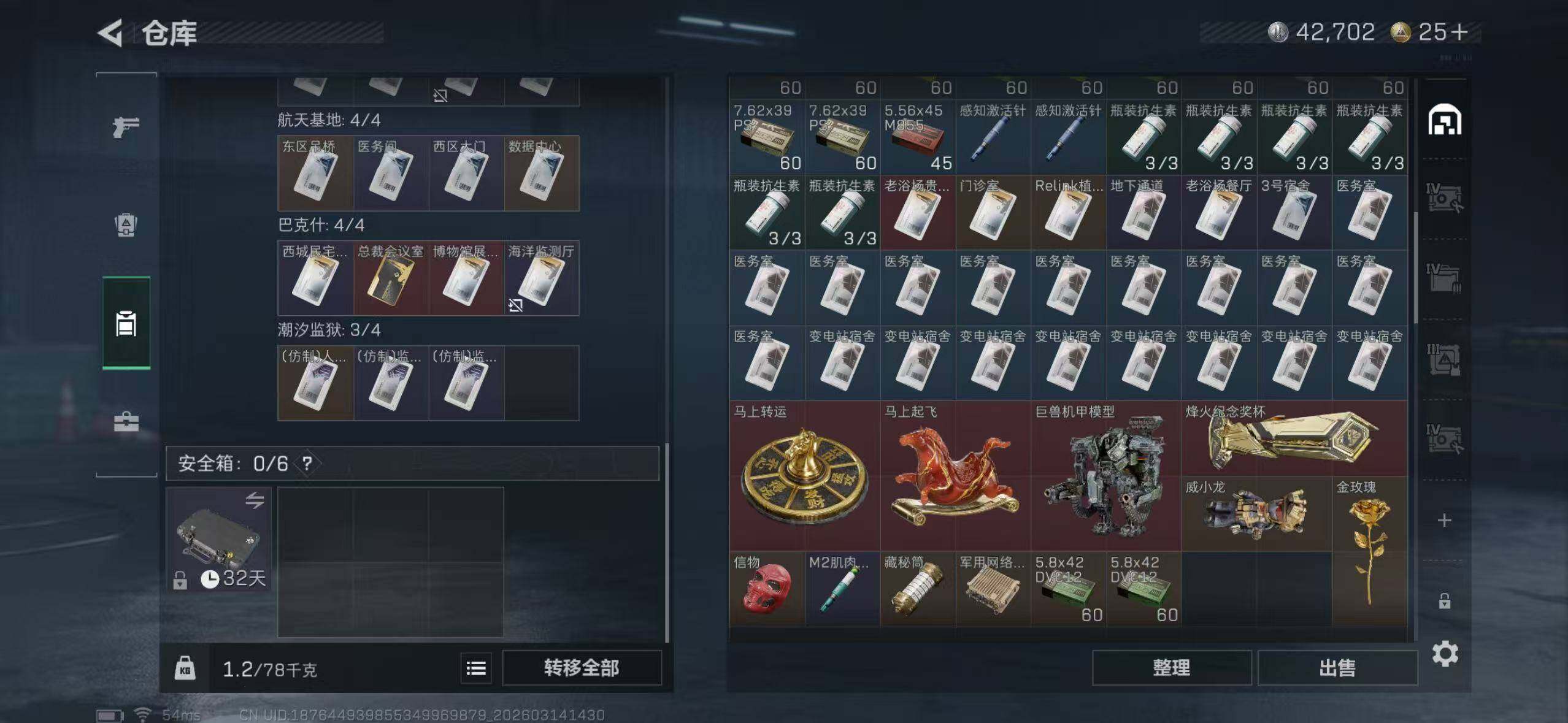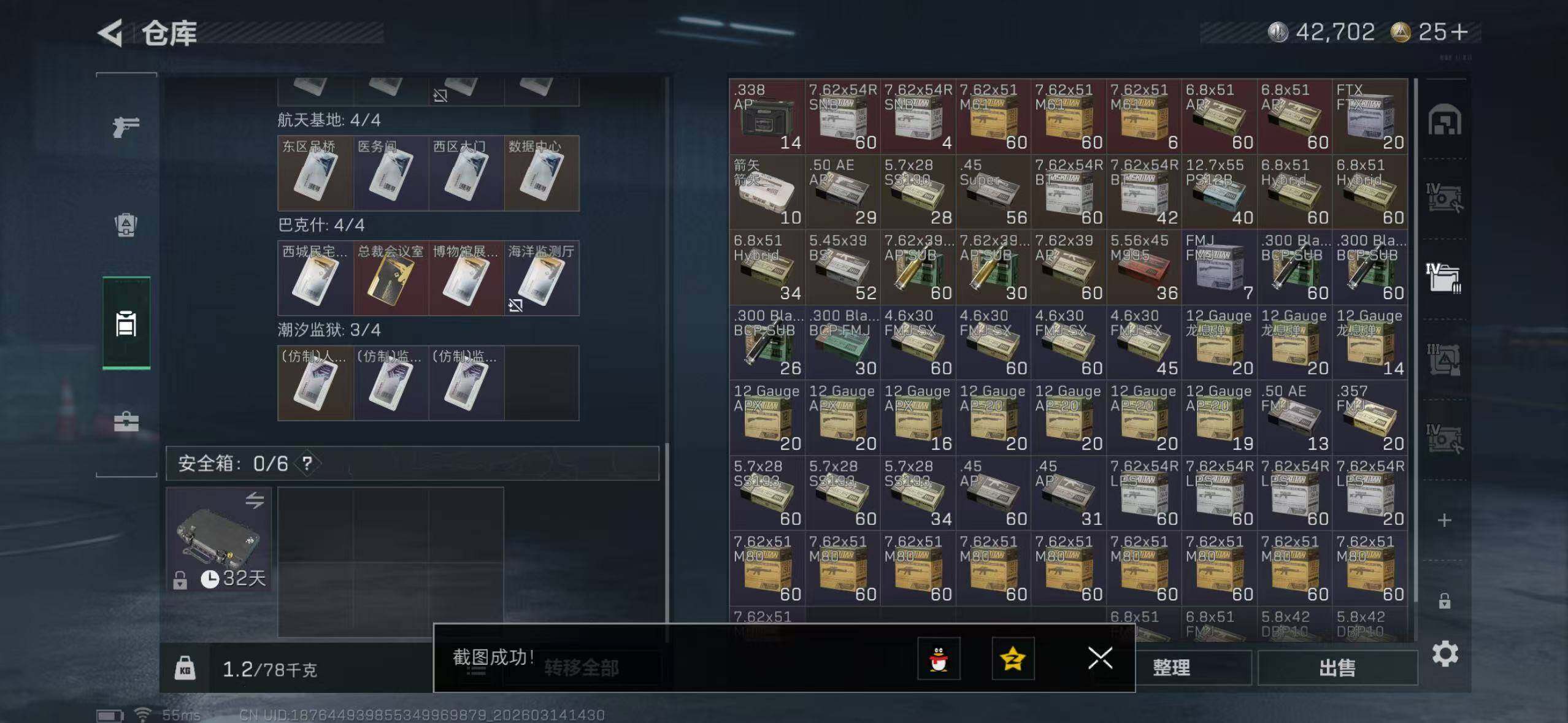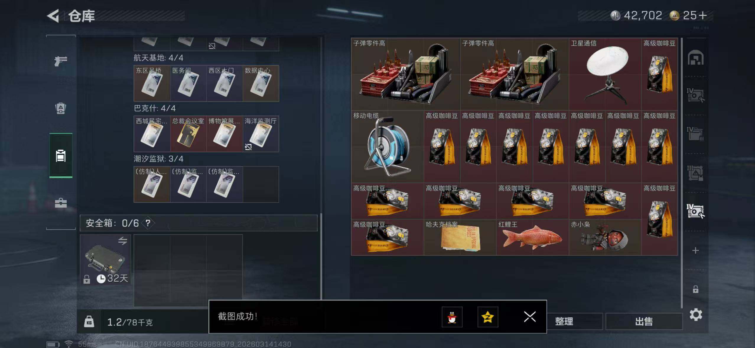 【SJ1391】等级:60 总资产:63.9M 哈夫币:276.1W 近战武器:近战武器-信条,近战武器-暗星,近战武器-处刑者 干员皮肤:电锯惊魂,金牌射手,不破誓约 典藏外观:腾龙突击步枪-气象感应 安全箱:高级安全箱6(2x3)