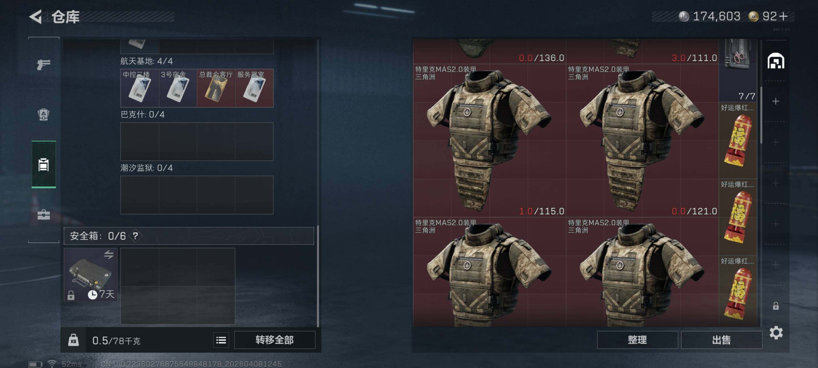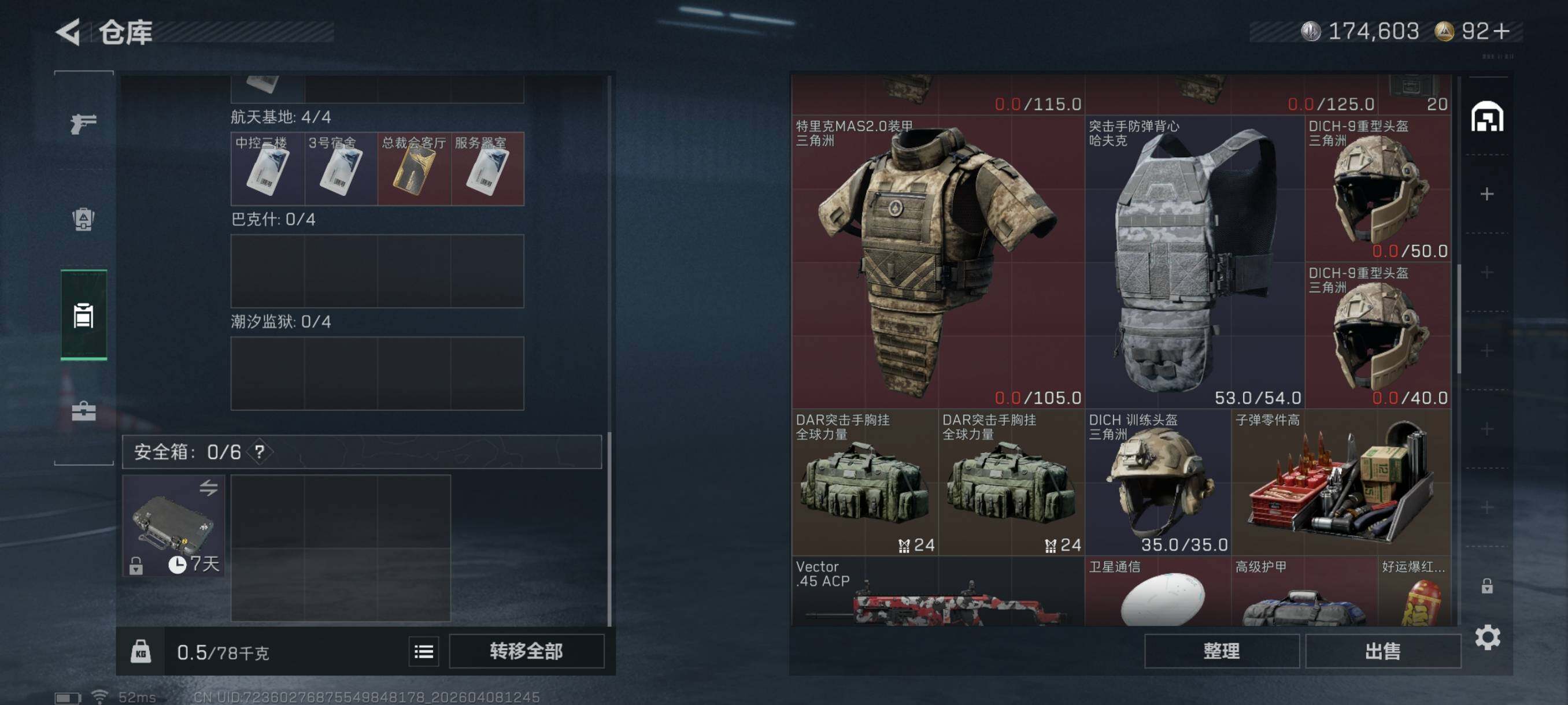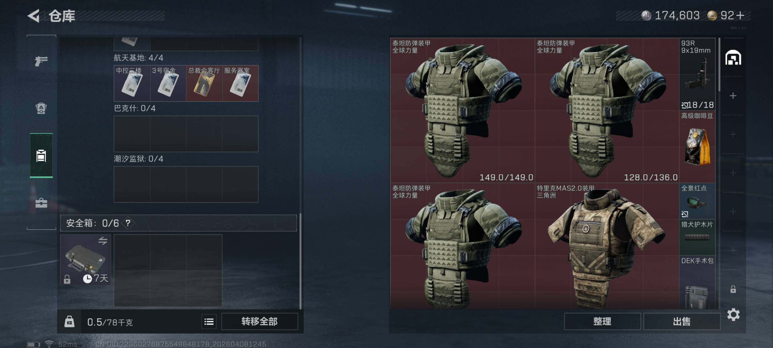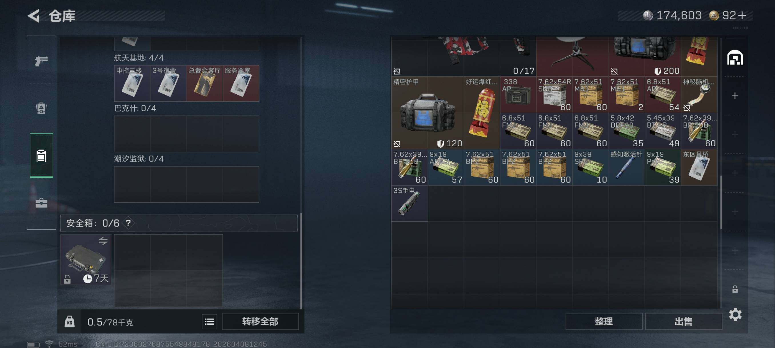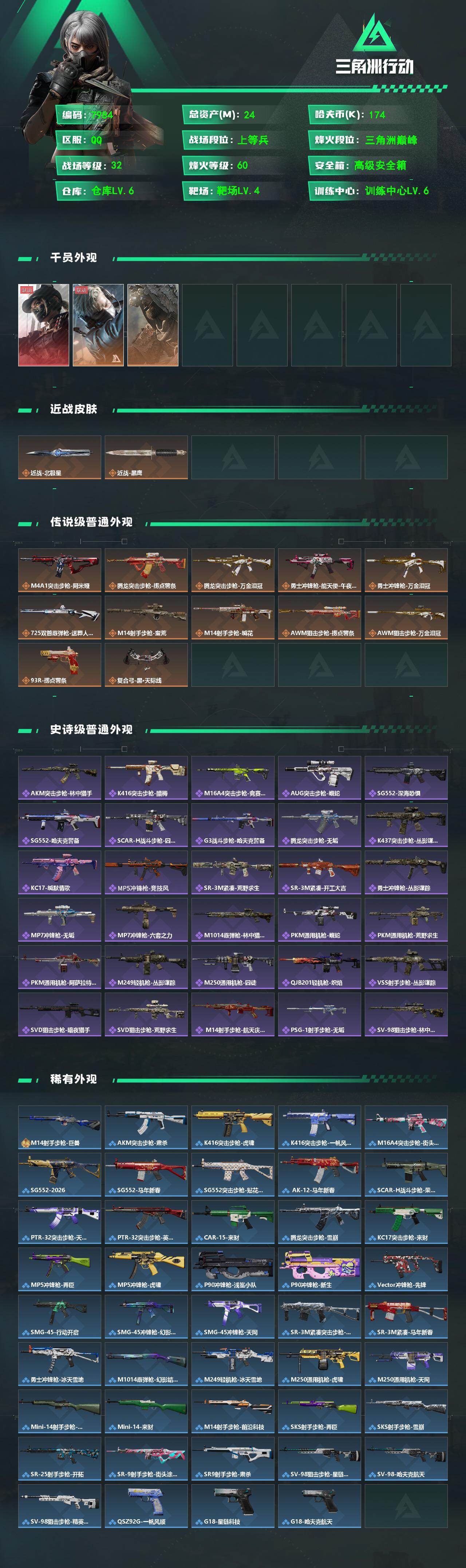 {特价出售}等级60 总资产24m 流动14.3m 纯币174603 人物皮 天际线 荒原猎手 刀皮北极星 特勤仓库6级 体力6级 负重4级