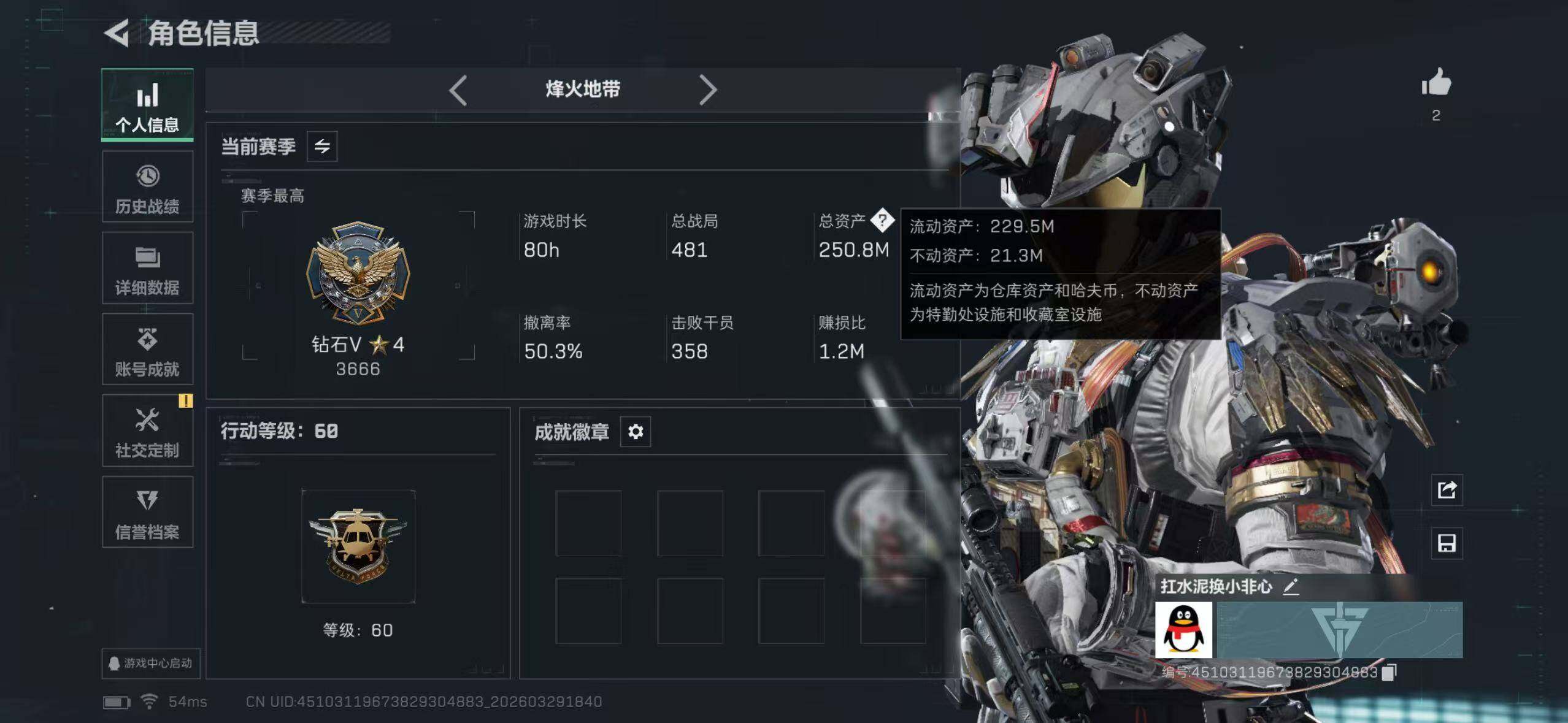 【SJ1593】250m总资产-182749k哈夫币-60烽火等级-钻石-1战场等级-无军衔