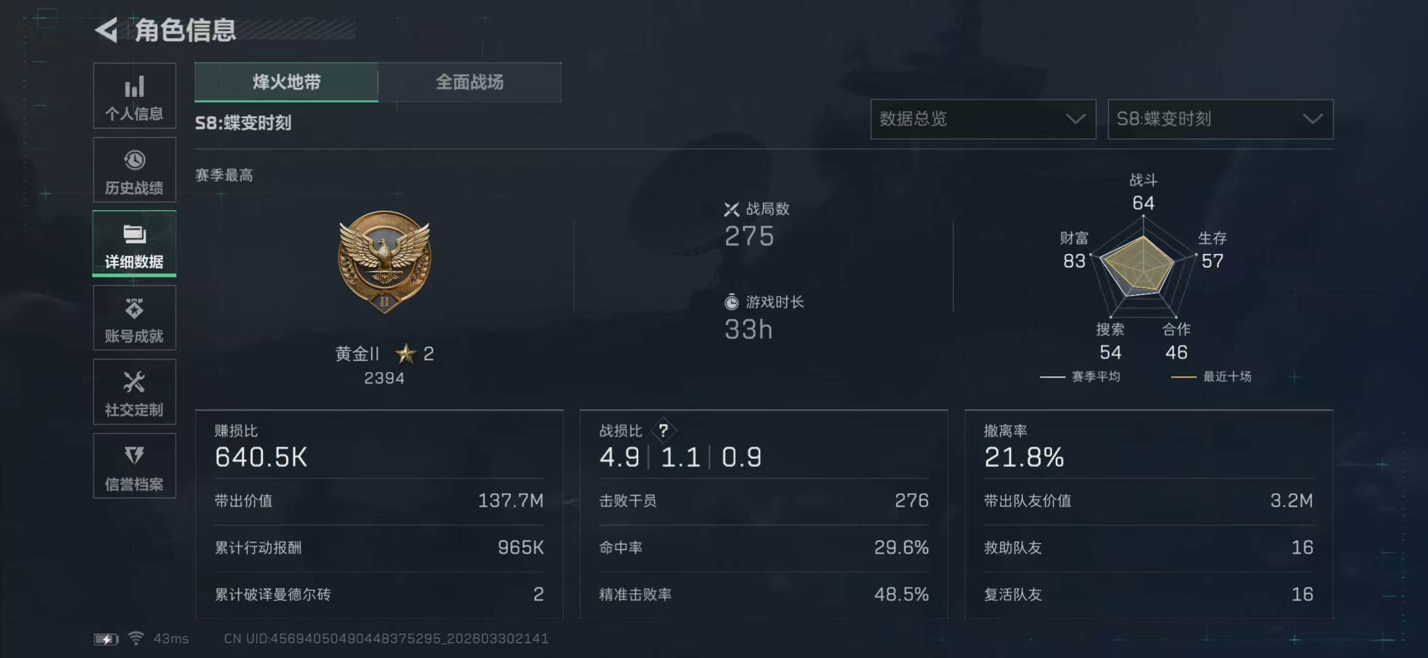 【2944】总资产(M):101M/哈夫币(K):20820K/哈夫币(K):20820K/烽火地带等级:60_段位:黄金/威龙-铁面判官/威龙-壮志凌云/乌鲁鲁-荒原猎手/蛊-不羁人生/近战-暗星/近战-影锋/近战-黑鹰/缄默情歌捆绑包/夜莺捆绑包/万金泪冠捆绑包/悠然茶歇捆绑包/QBZ95-1突击步枪-破军/K416突击步枪-行动记录/AUG突击步枪-悠然茶歇/SCAR-H战斗步枪-铁艺苍穹