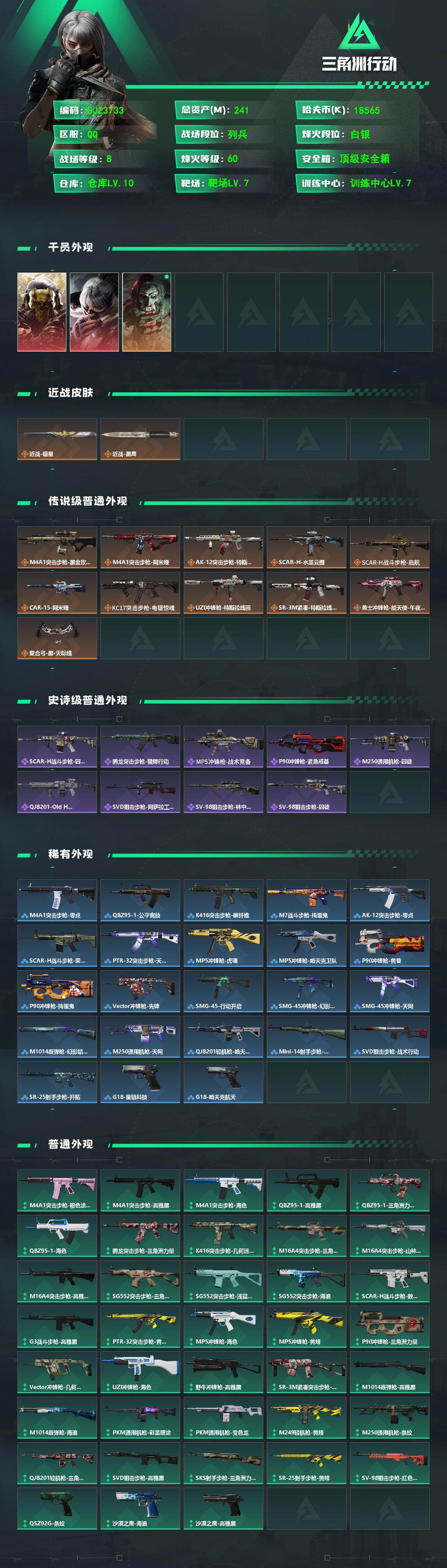 【SJZ3733】总资产(M):241M/哈夫币(K):18565K/哈夫币(K):18565K/传说枪皮数:11/全面战场等级:8_段位:列兵/烽火地带等级:60_段位:白银/红狼-蚀金玫瑰/骇爪-水墨云图/红狼-电锯惊魂/近战-暗星/近战-黑鹰/M4A1突击步枪-蚀金玫瑰/M4A1突击步枪-阿米娅/AK-12突击步枪-特斯拉线圈/SCAR-H战斗步枪-水墨云图/SCAR-H战斗步枪-启航/C