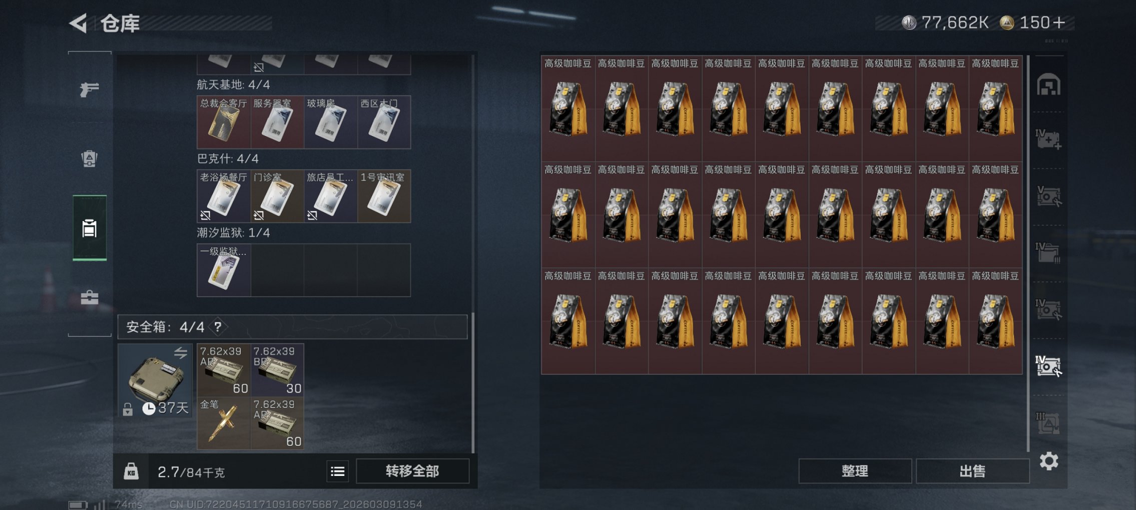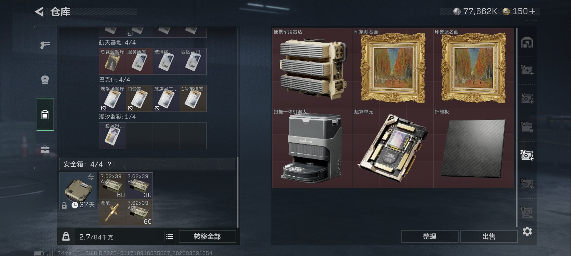 【总资产276M 红皮露娜 1颗AW子弹 哈夫币77,662K,行动等级:60