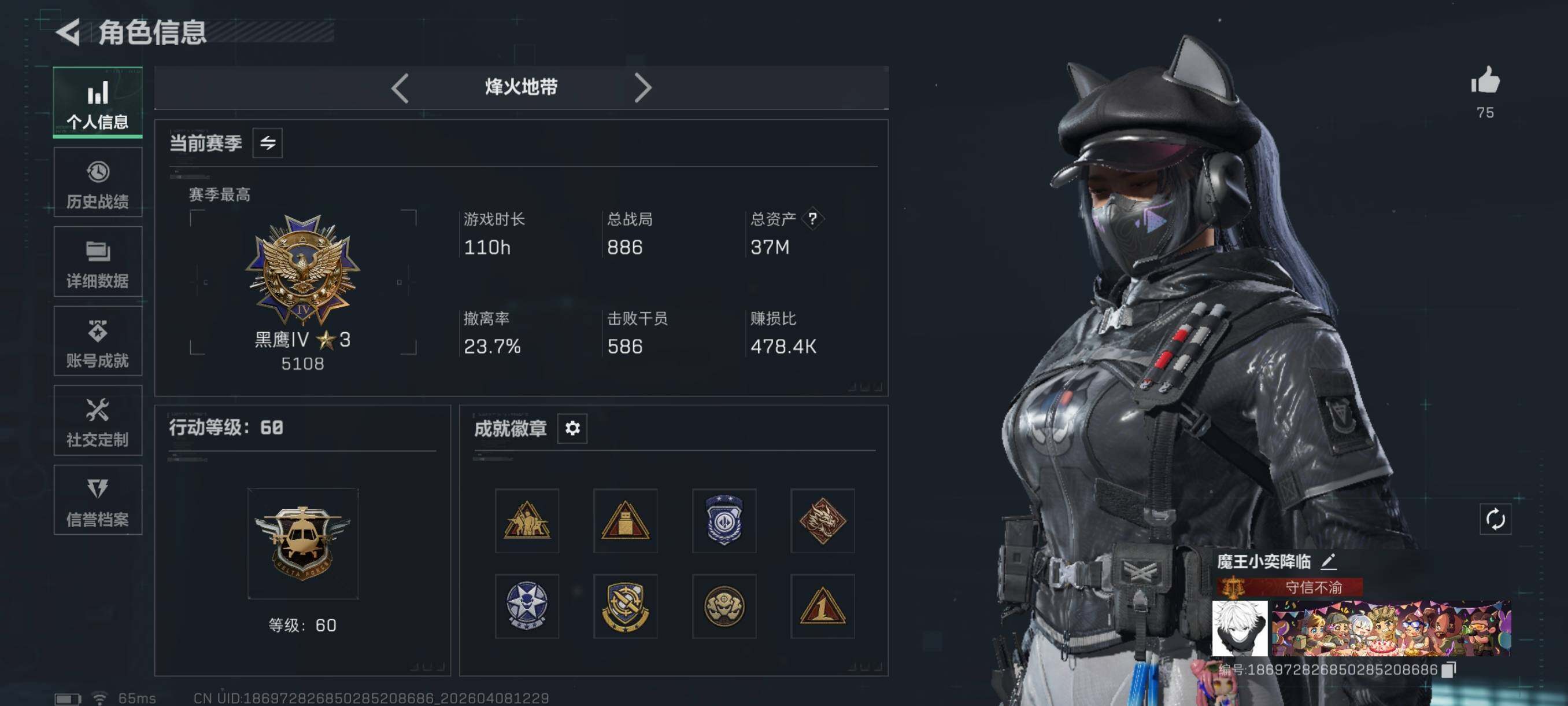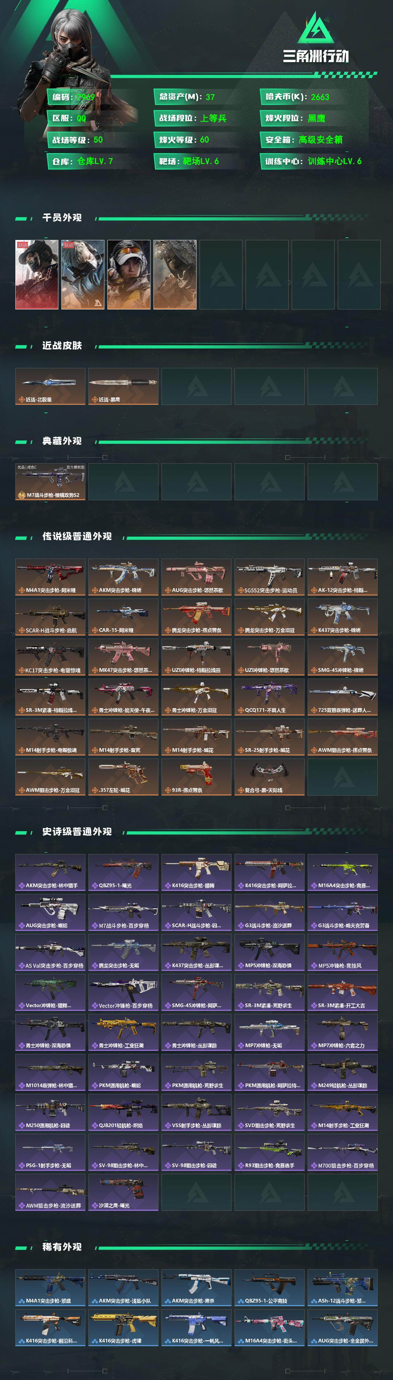 {特价出售}等级: 60 总资产:37M 流动资产: 21 M 纯币:2663k 隐藏挂饰: 2S余烬之影 红皮: 露娜联动 战令皮肤:金牌射手 蜂医无题密令 刀皮: 北极星 砖皮:M7棱镜攻势优品C 特勤处:仓库7,训练6,靶场6