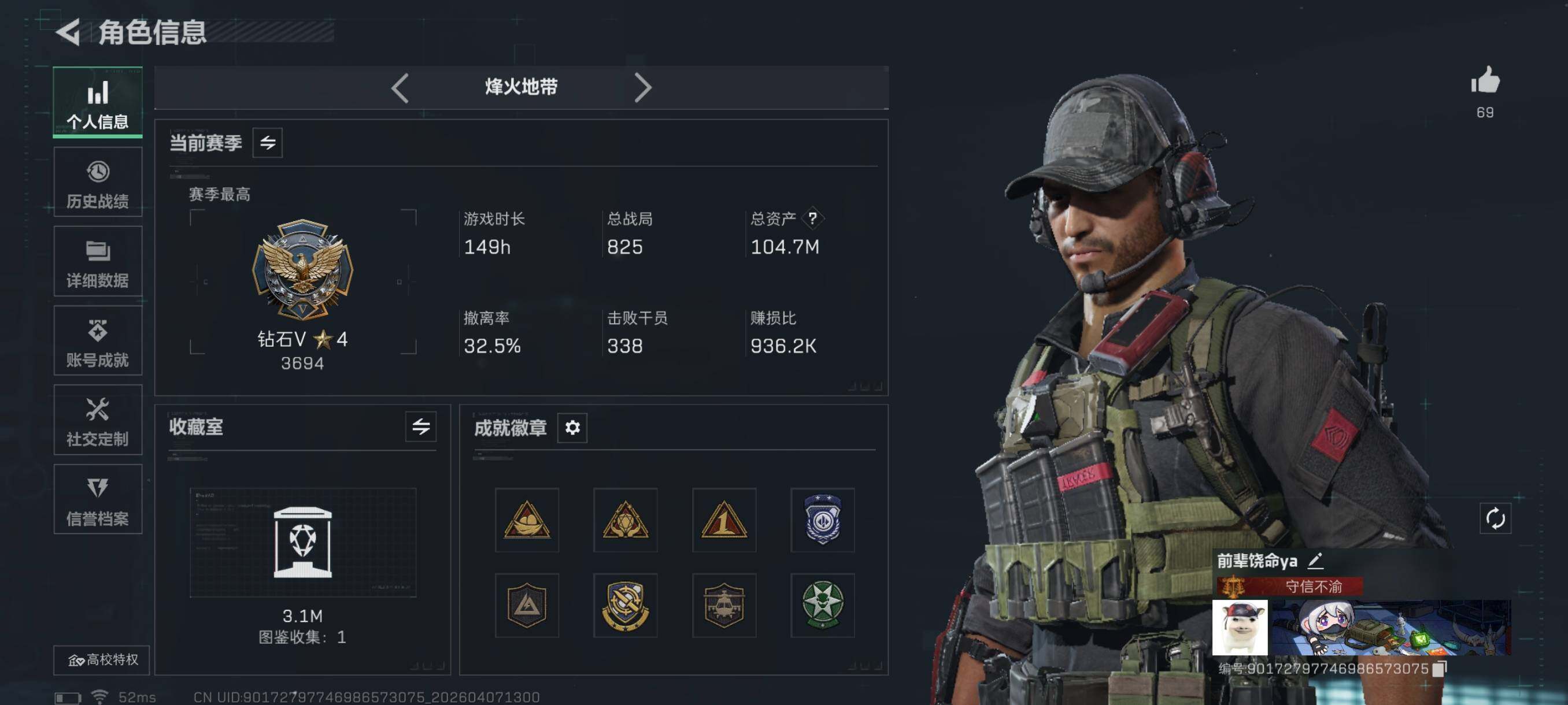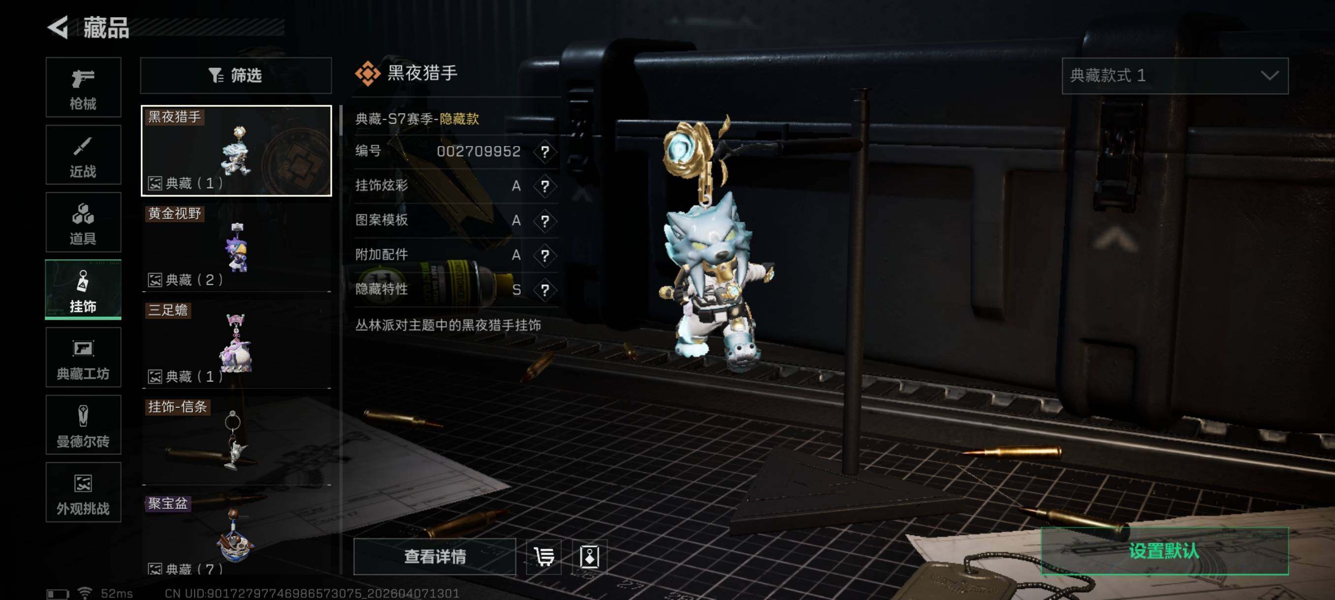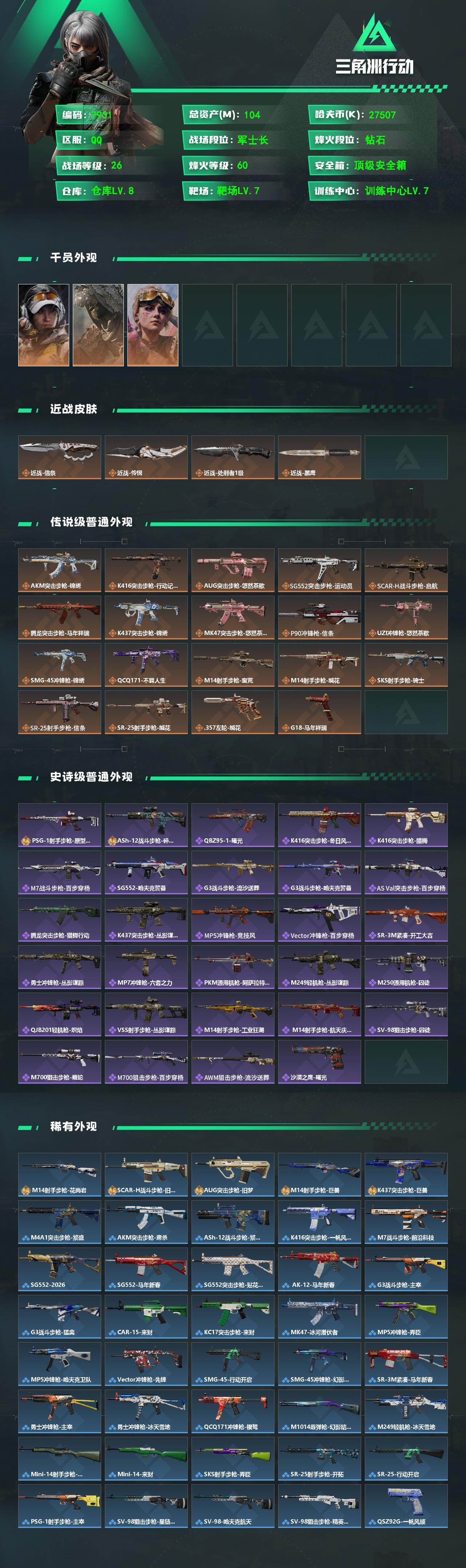 {特价出售}等级:60总资产:104.7M 纯币27507k 隐藏挂饰:S7黑夜猎手 红皮: 战令皮肤:荒原猎手 金牌射手 刀皮:怜悯 信条 处刑者1级 特勤处:仓库8,训练7,靶场7
