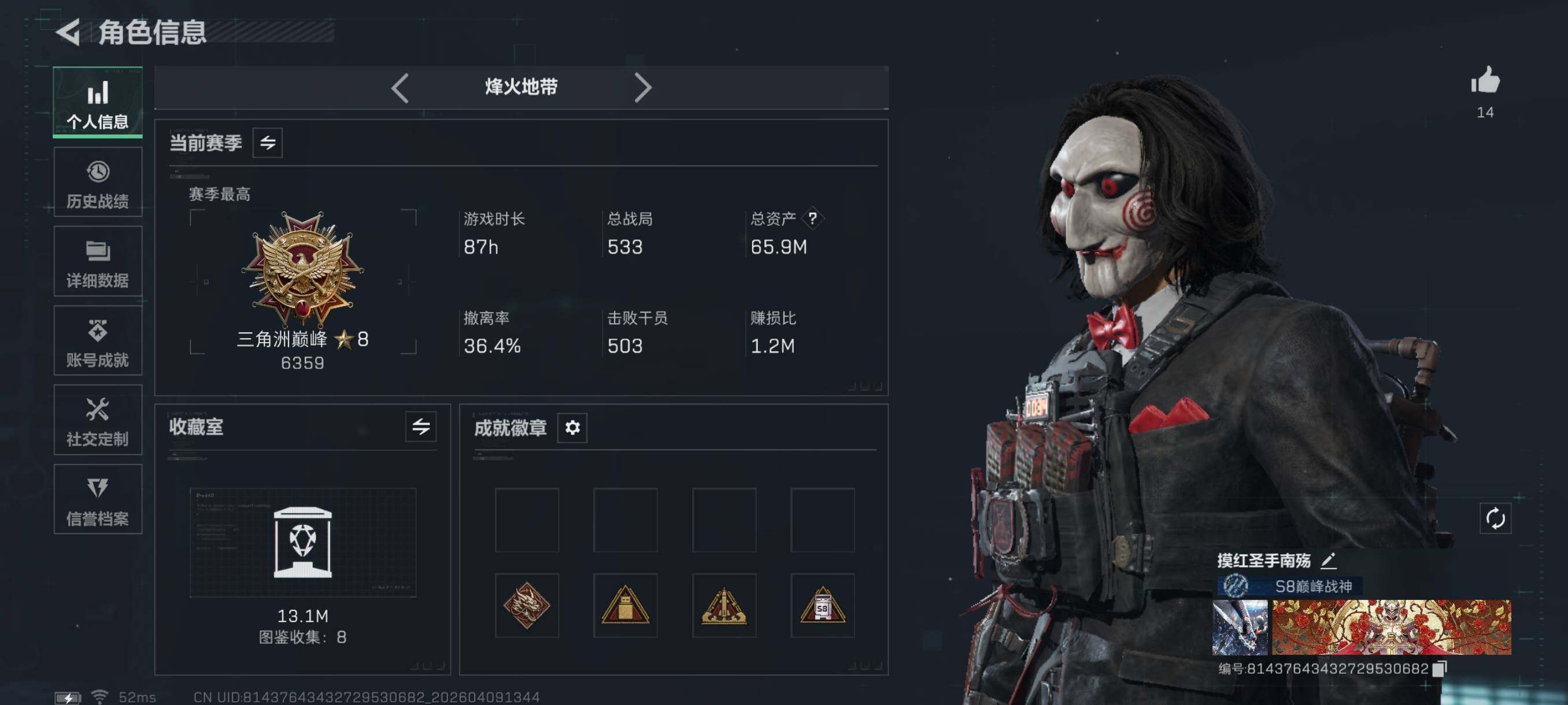 {特价出售}等级: 60 总资产:65.9M 流动资产: 24.3 M 纯币:3200k 红皮: 凌霄戍卫 战令皮肤:荒原猎手 金牌射手 刀皮:信条 砖皮:优品a 巨浪 特勤处:仓库8,训练7,靶场7