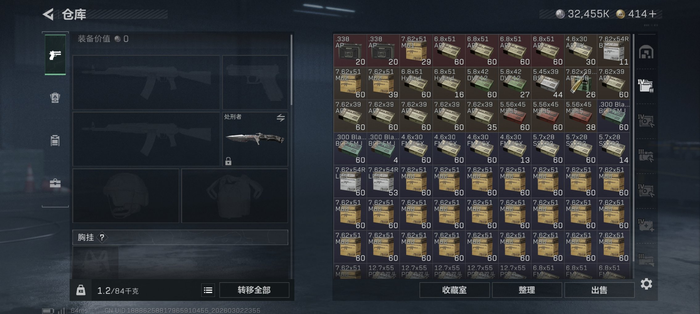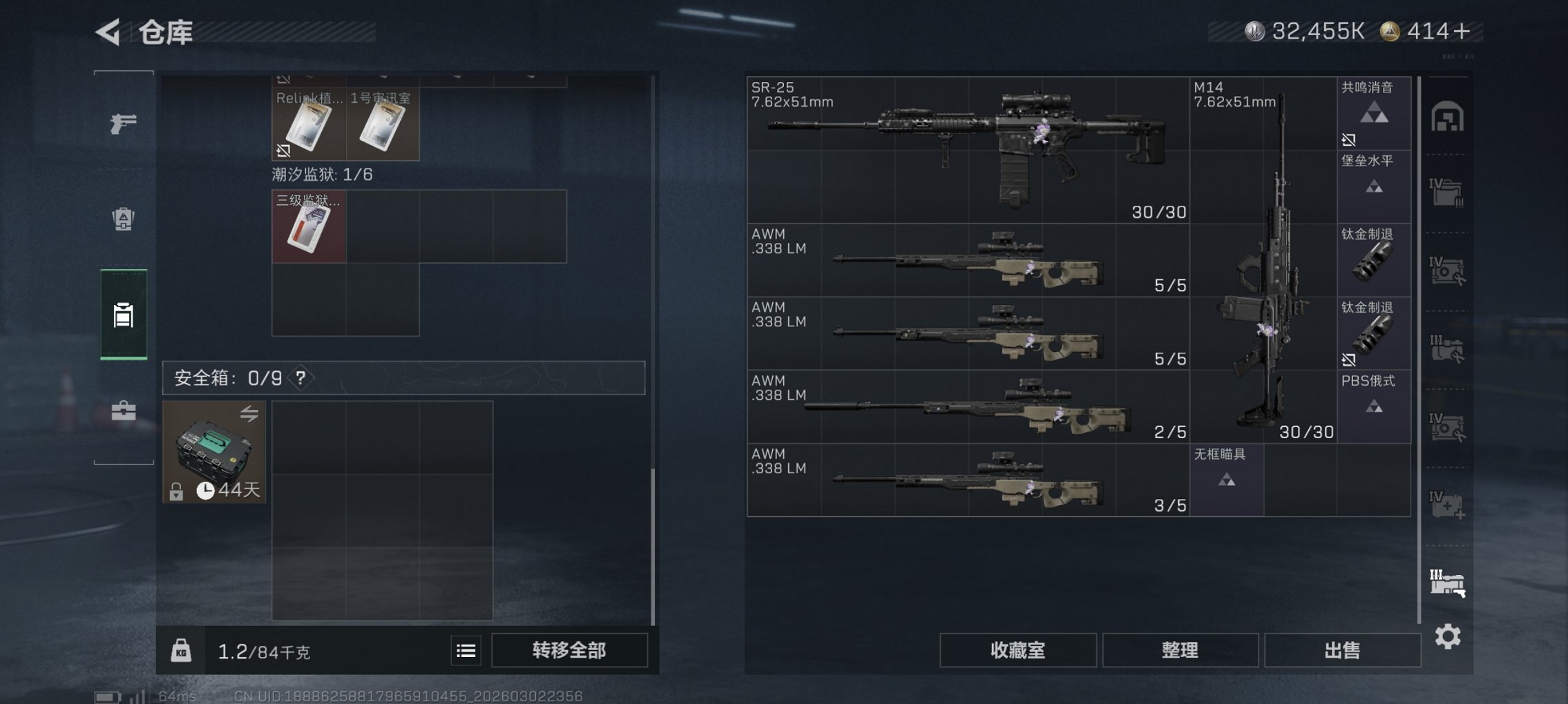 【总资产295M S8赛季顶级安全箱 40颗AW子弹 3级处刑者 哈夫币32,455K,行动等级:60,近战数量:1,仓库等级:8级,训练中心等级:6级,靶场等级:6级,干员皮肤:2,枪皮:144 秒换绑不用等】