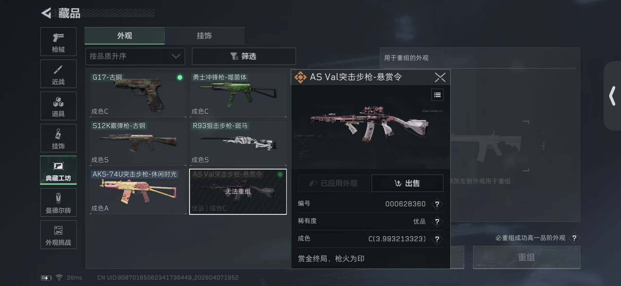 【SJC2078】总资产(M):85M/哈夫币(K):904K/哈夫币(K):904K/传说枪皮数:44/全面战场等级:23_段位:上等兵/烽火地带等级:60_段位:黑鹰/红狼-蚀金玫瑰/深蓝-不破誓约/红狼-电锯惊魂/露娜-金牌射手/乌鲁鲁-荒原猎手/蛊-不羁人生/近战-暗星/近战-信条/近战-处刑者3级/近战-黑鹰/AS Val突击步枪-悬赏令/AS Val突击步枪-悬赏令(优品C)/M4A