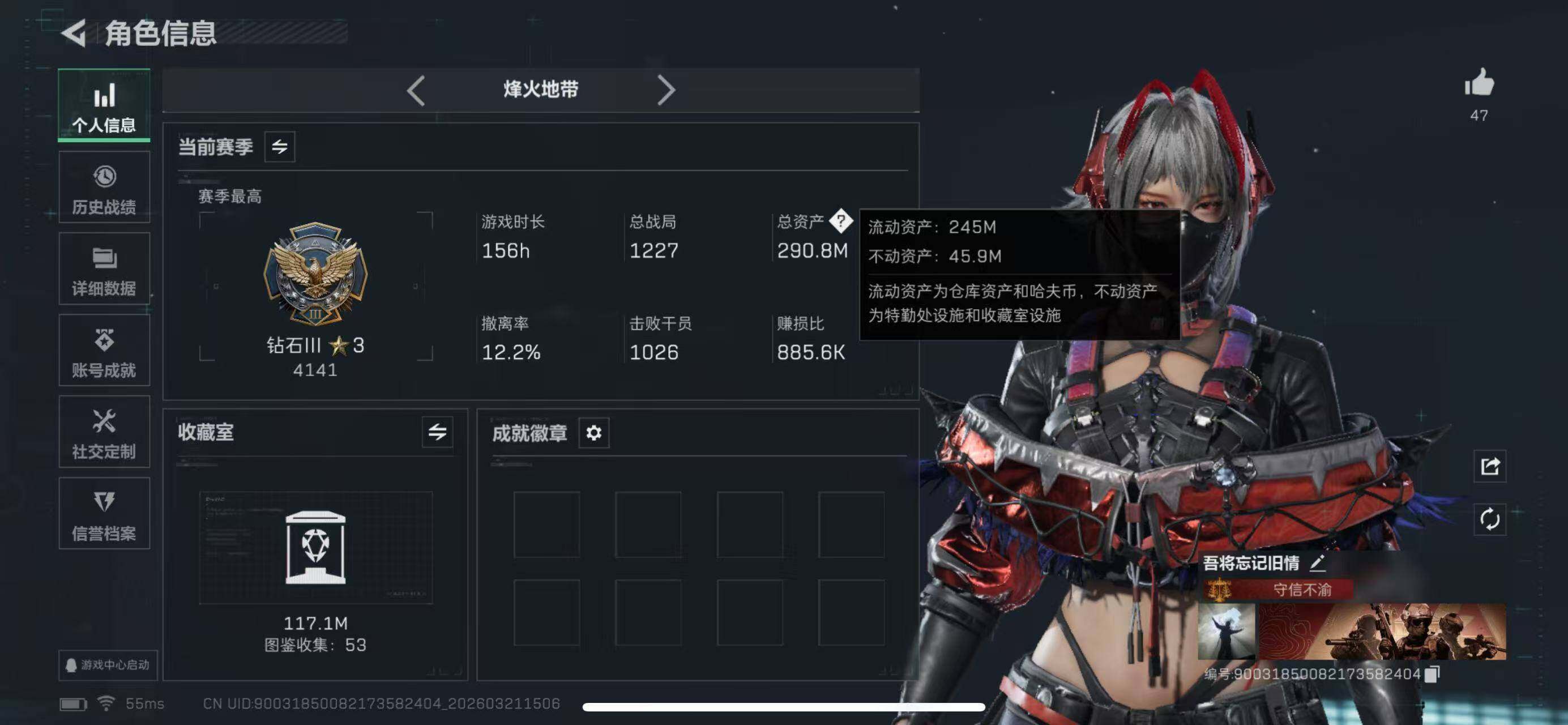 【SJ1495】288m总资产-55295k哈夫币-60烽火等级-钻石-29战