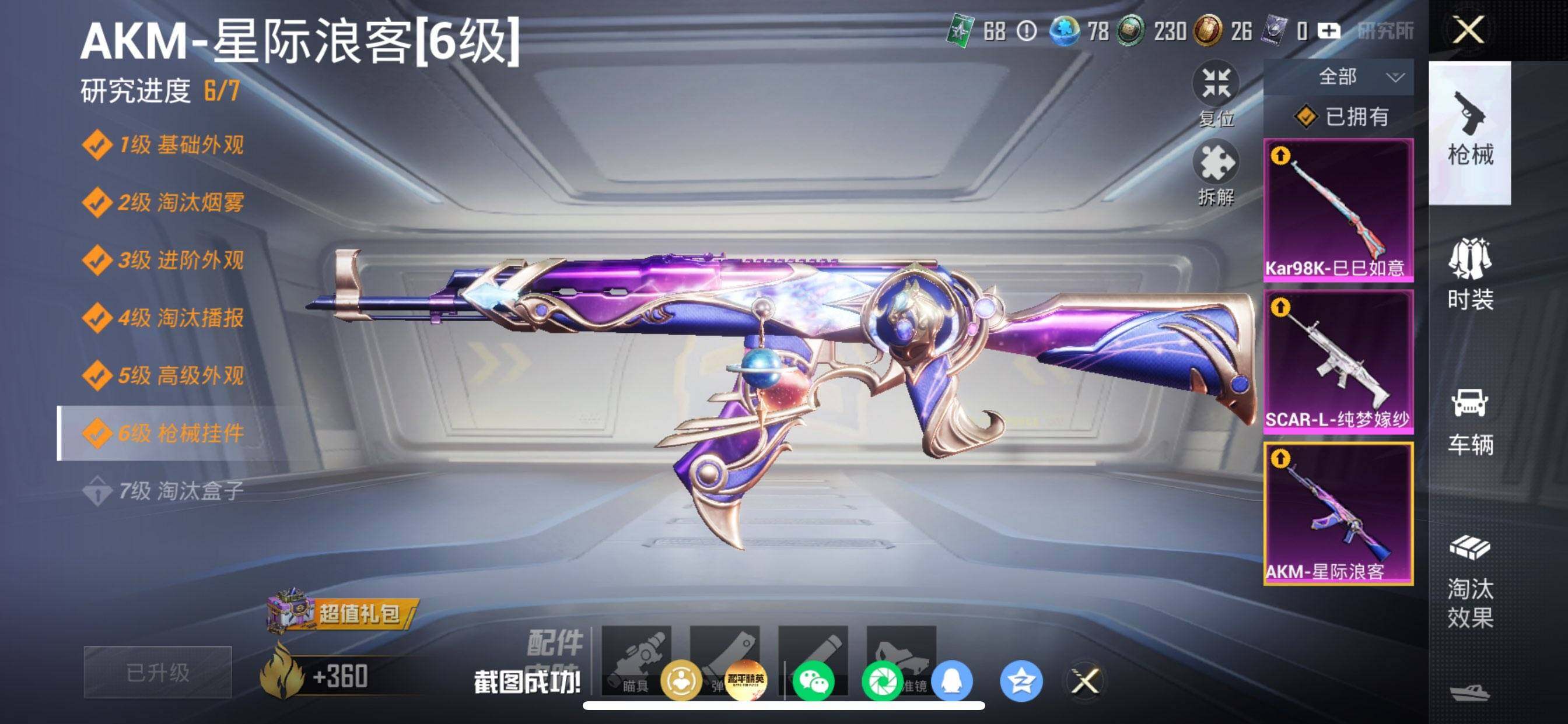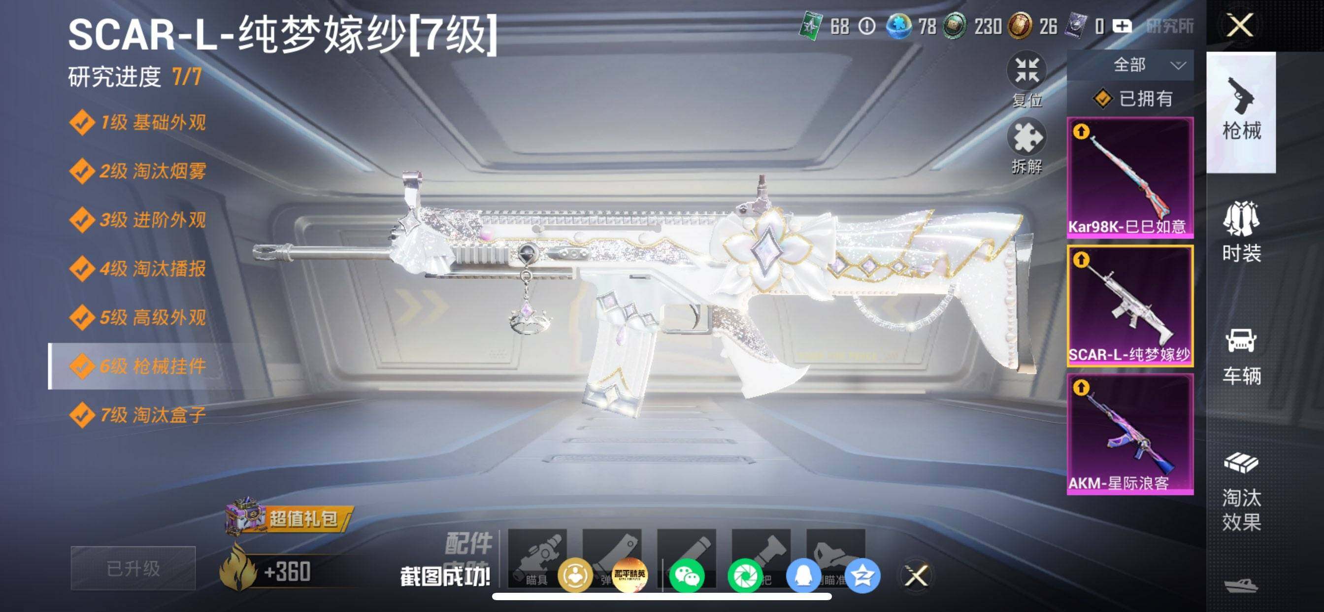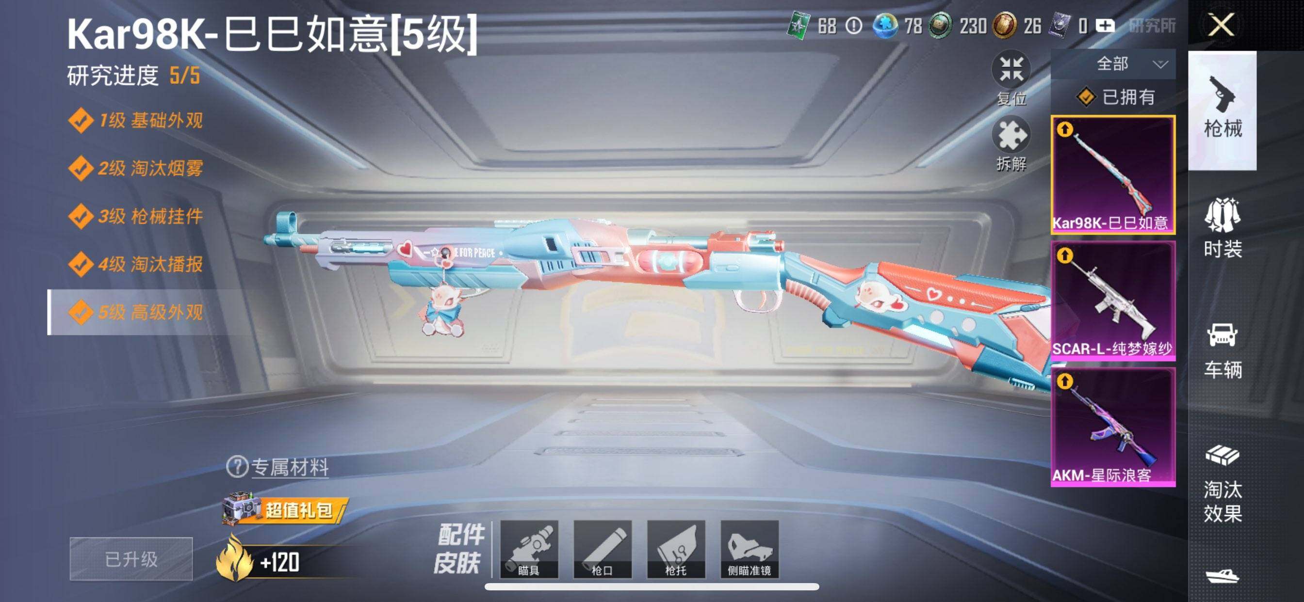 【粉色枪皮等级】:AKM-星际浪客(六级),SCAR-L-纯梦嫁纱(七级),Kar98K-巳巳如意(五级)