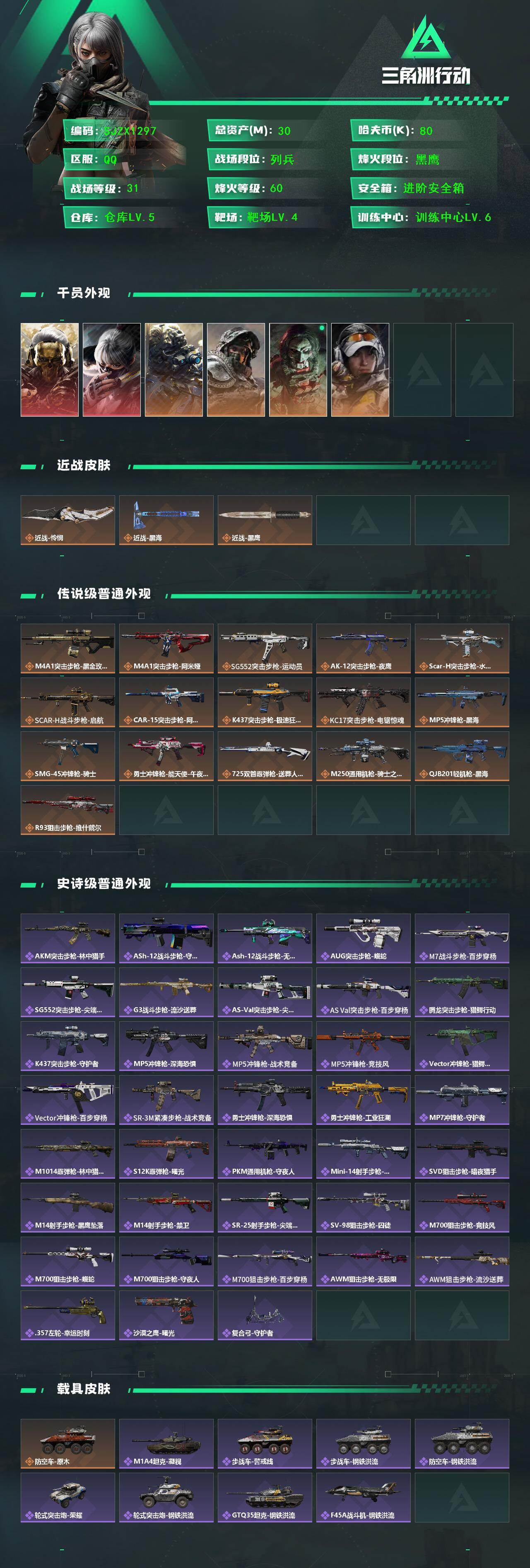 【SJZX1297】总资产(M):30M/哈夫币(K):80K/哈夫币(K):80K/传说枪皮数:16/全面战场等级:31_段位:列兵/烽火地带等级:60_段位:黑鹰/红狼-蚀金玫瑰/骇爪-水墨云图/无名-夜鹰/深蓝-不破誓约/红狼-电锯惊魂/露娜-金牌射手/近战-怜悯/近战-黑海/近战-黑鹰/M4A1突击步枪-蚀金玫瑰/M4A1突击步枪-阿米娅/SG552突击步枪-运动员/AK-12突击步枪-