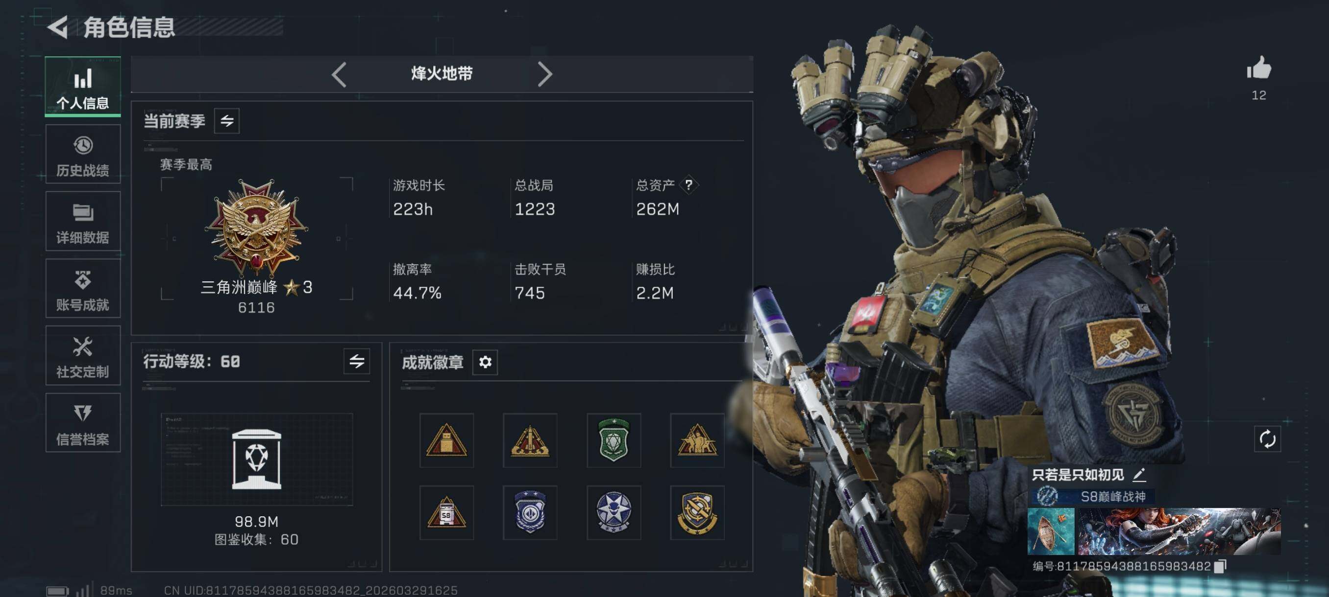 {特价出售}等级:60总资产:262M 纯币20357K 红皮:蛊-不羁人生/乌鲁鲁-荒原猎手/露娜-金牌射手 刀皮: 近战-信条/近战-黑鹰 特勤处:仓库7,训练6,靶场6