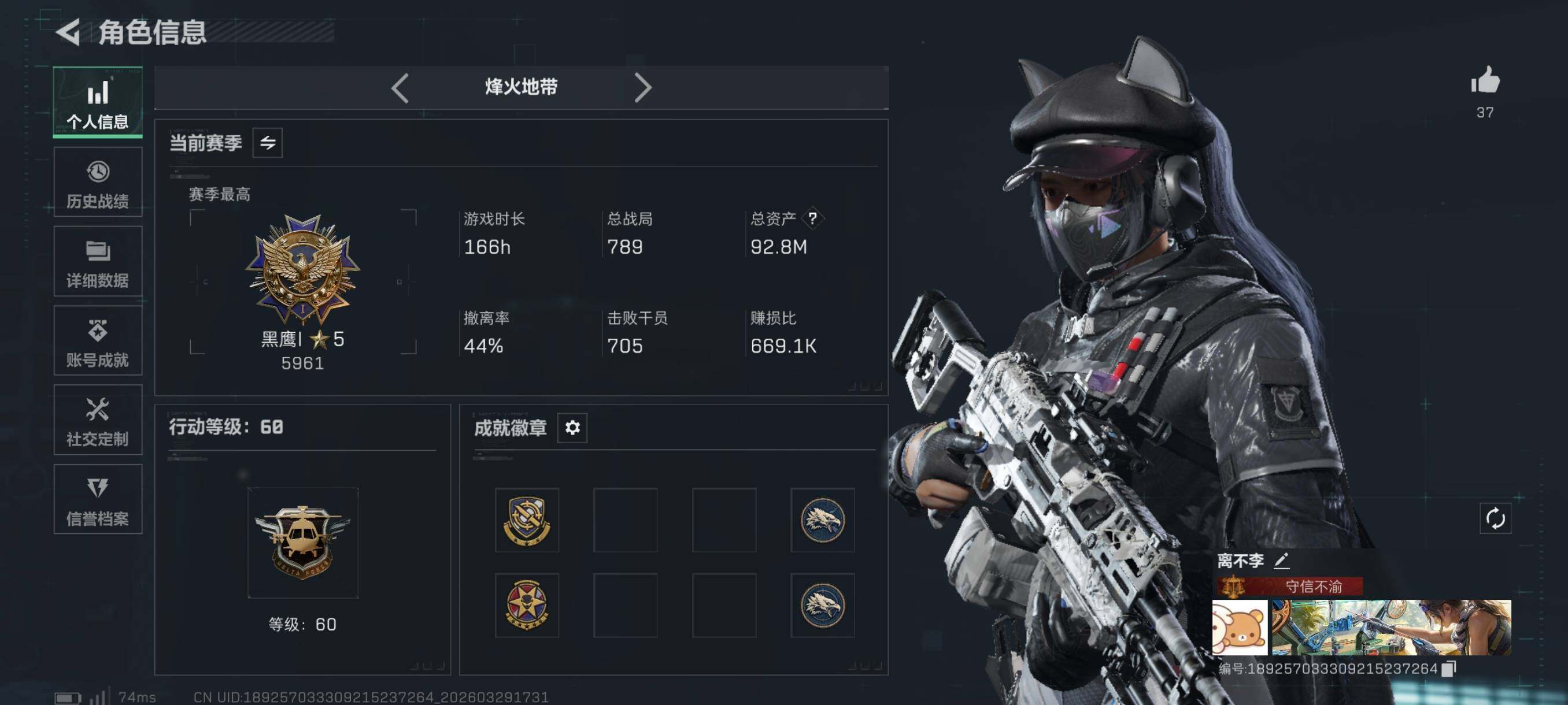 {特价出售}等级:60总资产:92.8M 纯币53250k 红皮:黑天际线 荒原猎手 刀皮 信条 暗星 特勤处:仓库5,训练7,靶场7