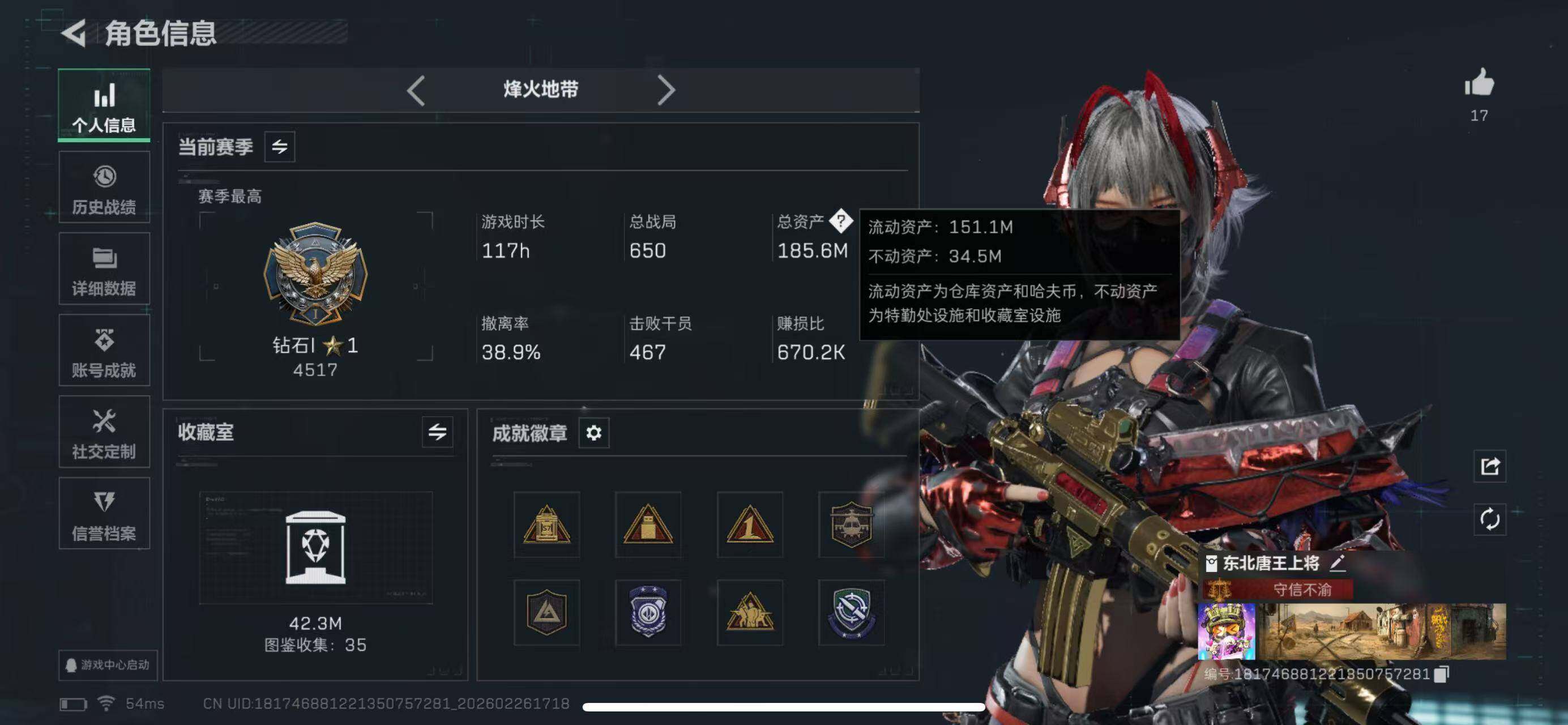 【SJ1219】184m总资产-17260k哈伏币-60烽火等级-钻石-18战场等级-上等兵